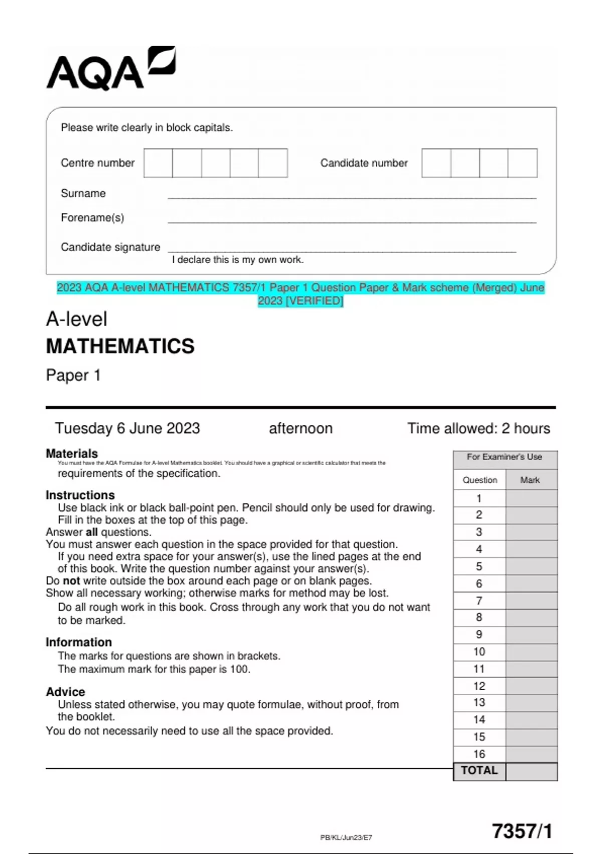 2023 AQA A-level MATHEMATICS 7357/1 Paper 1 Question Paper & Mark scheme (Merged) June 2023 [VERIFIED]
