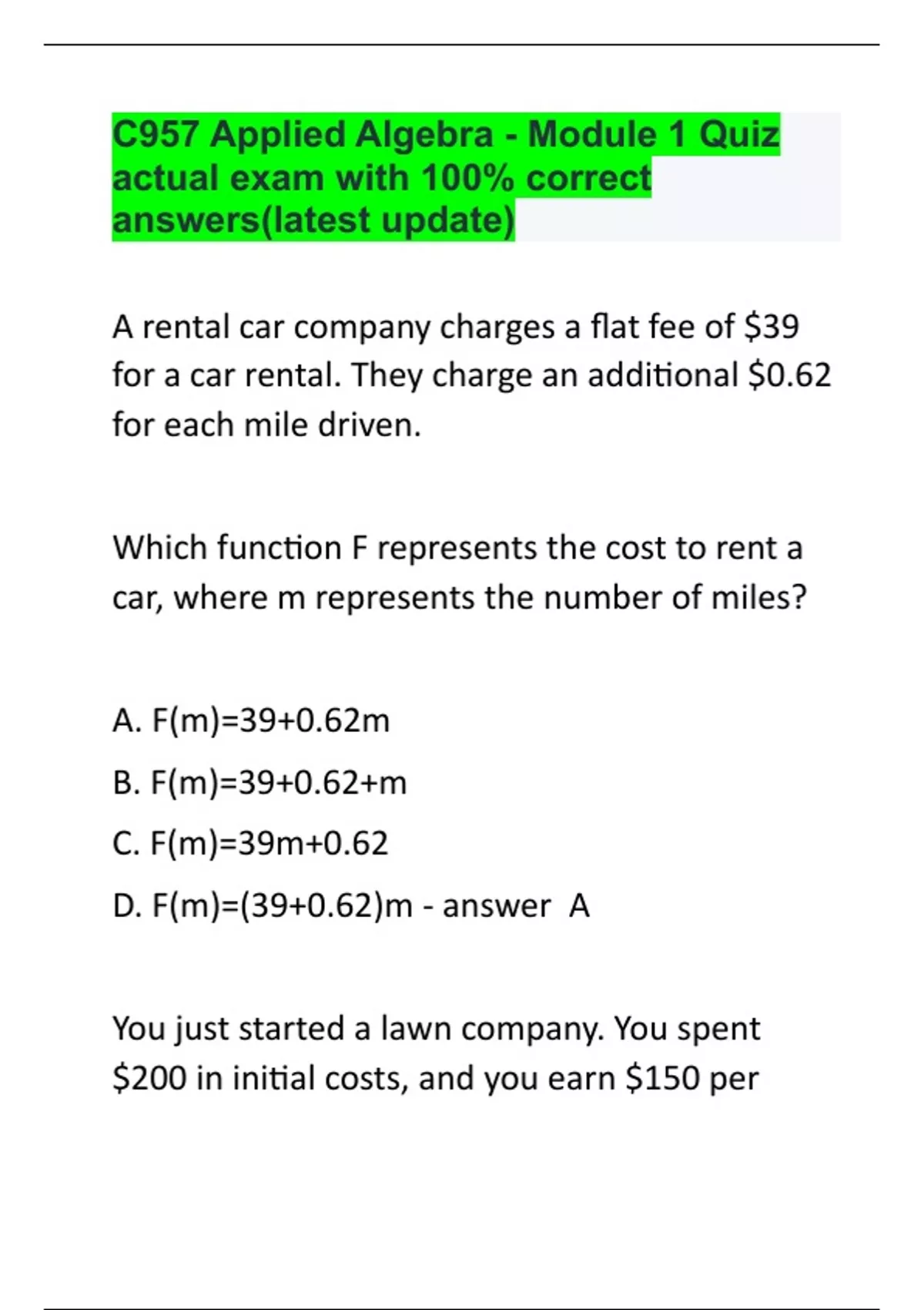 C957 Applied Algebra - Module 1 Quiz actual exam with 100% correct answers(latest update).
