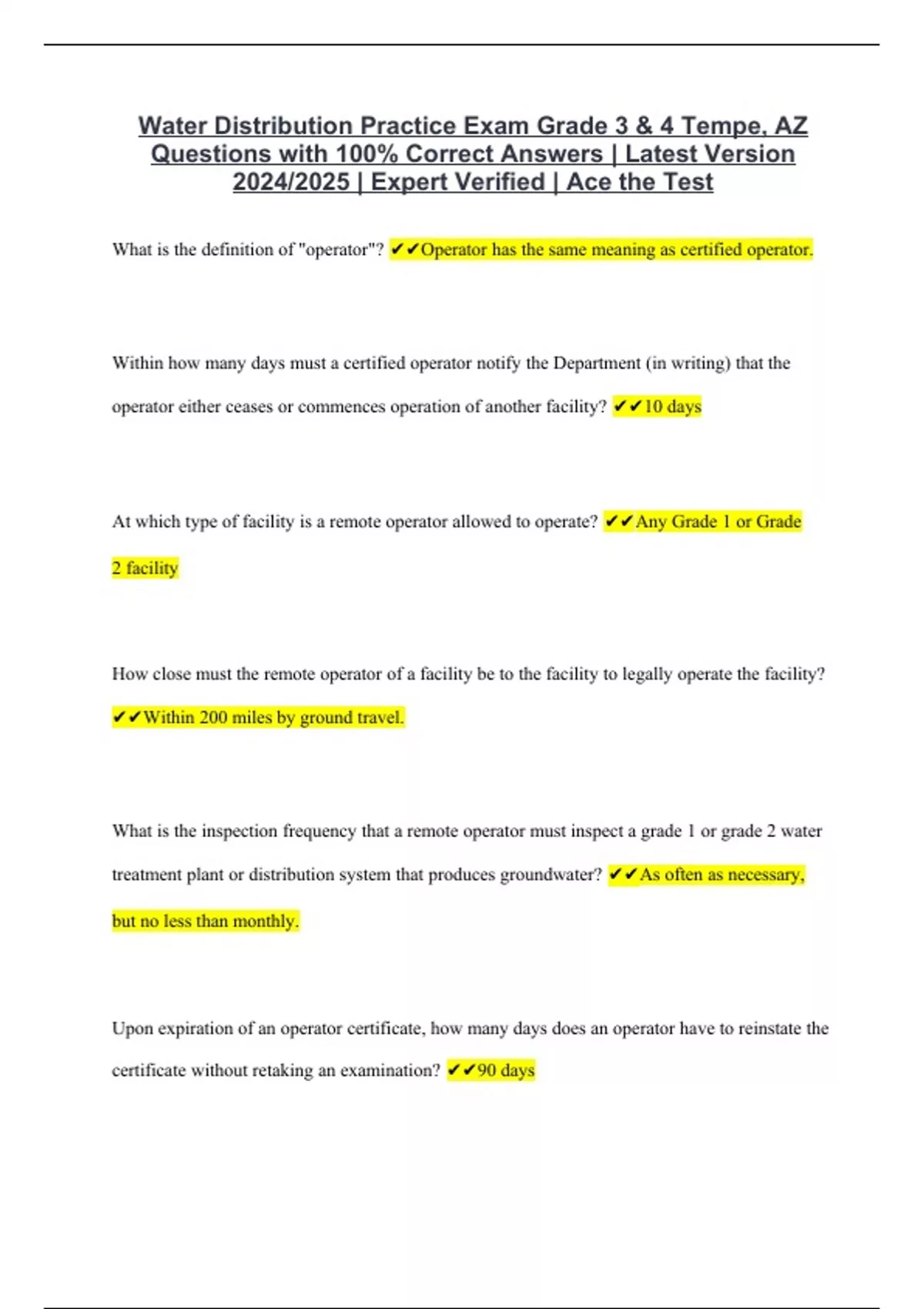 Water Distribution Practice Exam Grade 3 & 4 Tempe, AZ Questions with 100% Correct Answers | Latest Version 2024/2025 | Expert Verified | Ace the Test