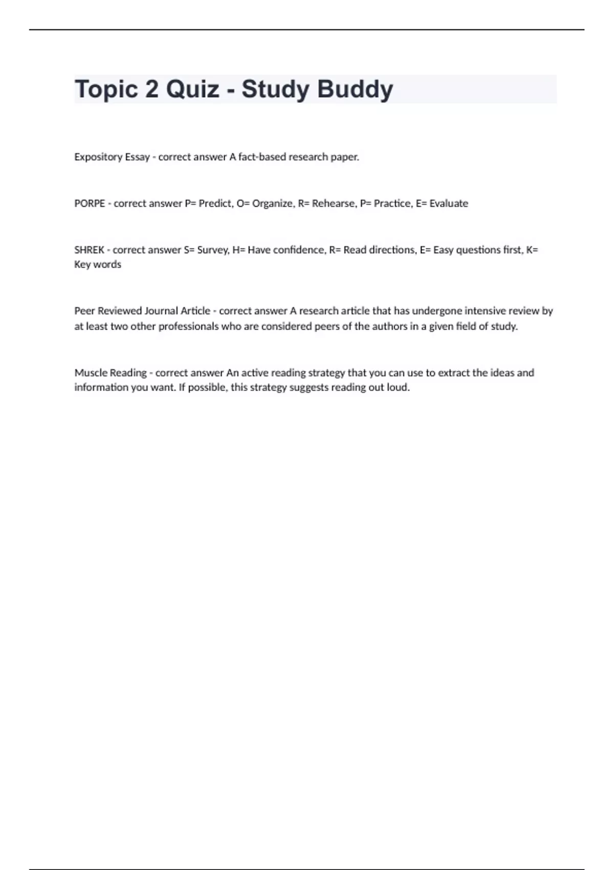 Topic 2 Quiz - Study Buddy questions n answers graded A+Expository Essay - correct answer A fact-based research paper. PORPE - correct answer P= Predict, O= Organize, R= Rehearse, P= Practice, E= Evaluate SHREK - correct answer S= Survey, H= Have confidence, R= Read directions, E= Easy questions first, K= Key words Peer Reviewed Journal Article - correct answer A research article that has undergone intensive review by at least two other professionals who are considered peers of the authors in a given field of study. Muscle Reading - correct answer An active reading strategy that you can use to extract the ideas and information you want. If possible, this strategy suggests reading out loud.