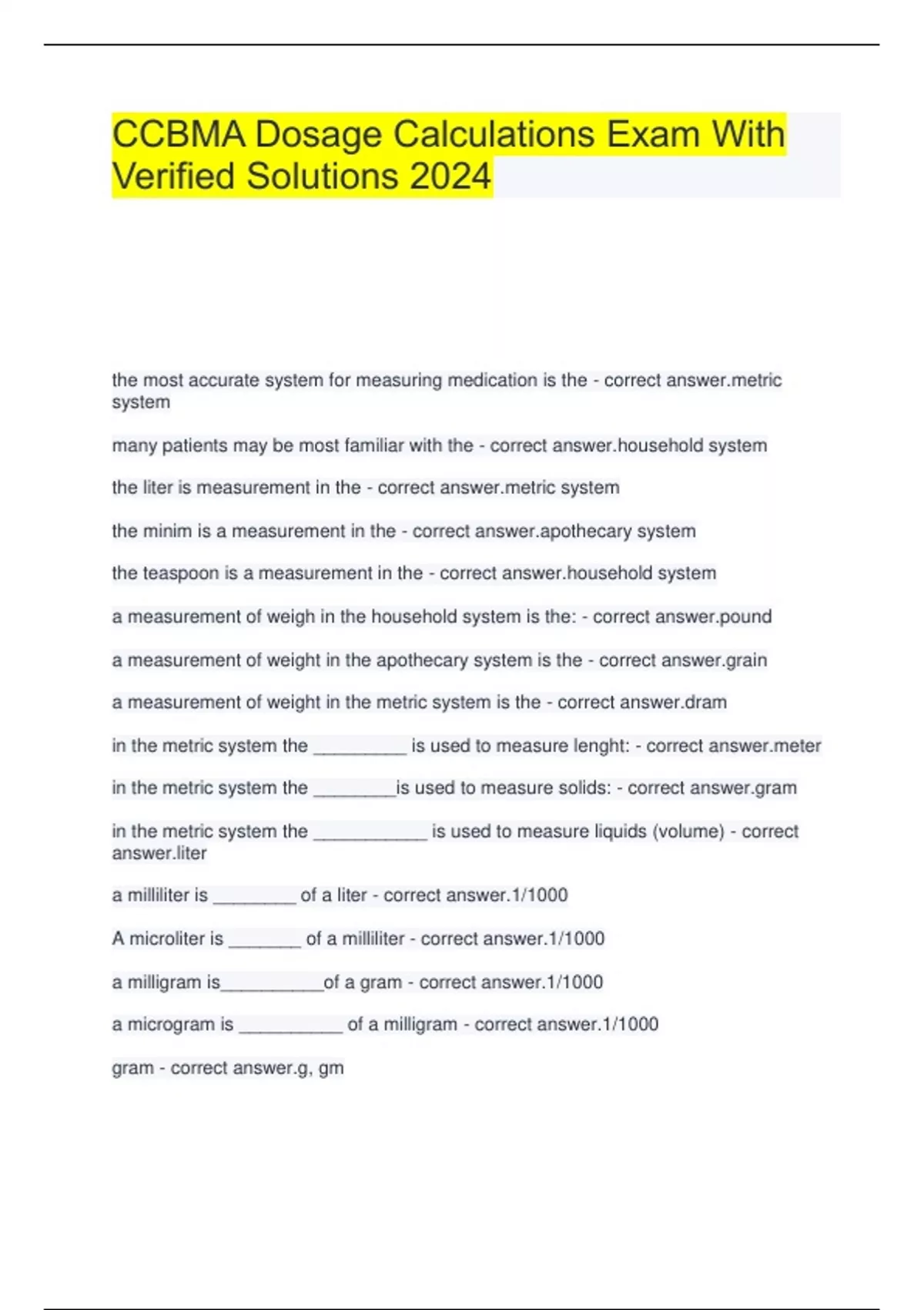 CCBMA Dosage Calculations Exam With Verified Solutions 2024