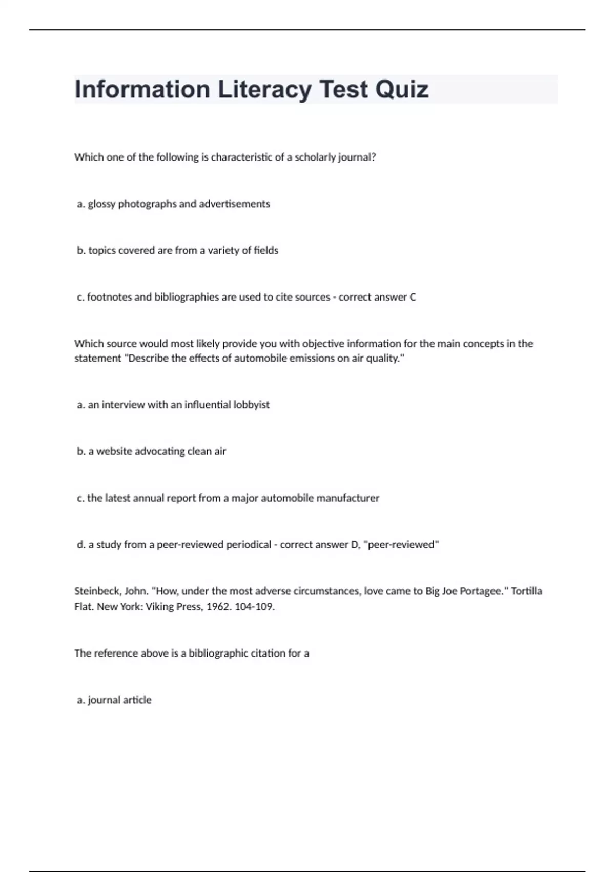Information Literacy Test Quiz well answeredWhich one of the following is characteristic of a scholarly journal? a. glossy photographs and advertisements b. topics covered are from a variety of fields c. footnotes and bibliographies are used to cite sources - correct answer C Which source would most likely provide you with objective information for the main concepts in the statement "Describe the effects of automobile emissions on air quality." a. an interview with an influential lobbyist b. a website advocating clean air c. the latest annual report from a major automobile manufacturer d. a study from a peer-reviewed periodical - correct answer D, "peer-reviewed" Steinbeck, John. "How, under the most adverse circumstances, love came to Big Joe Portagee." Tortilla Flat. New York: Viking Press, 1962. 104-109. The reference above is a bibliographic citation for a a. journal article