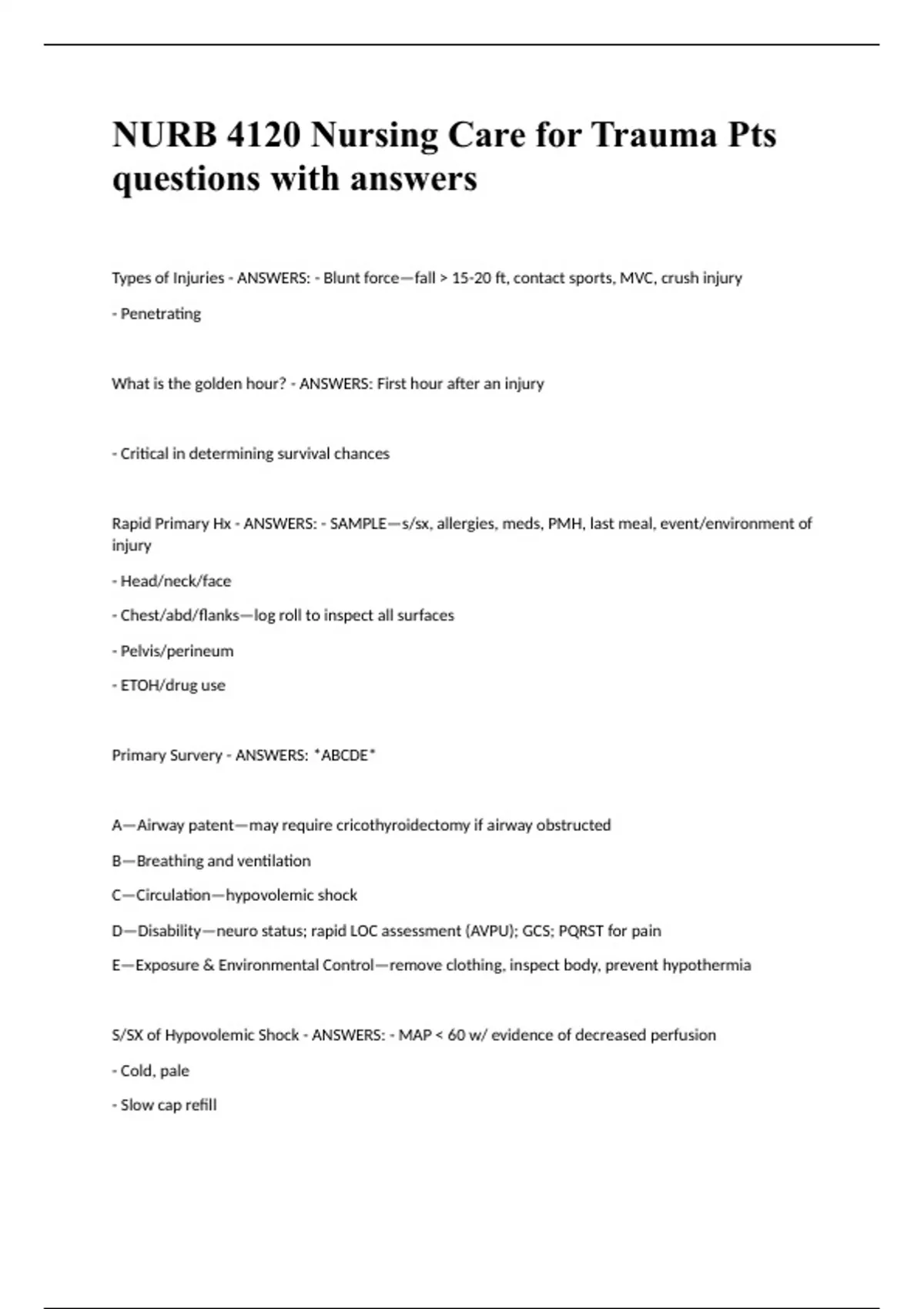NURB 4120 Nursing Care for Trauma Pts questions with answers