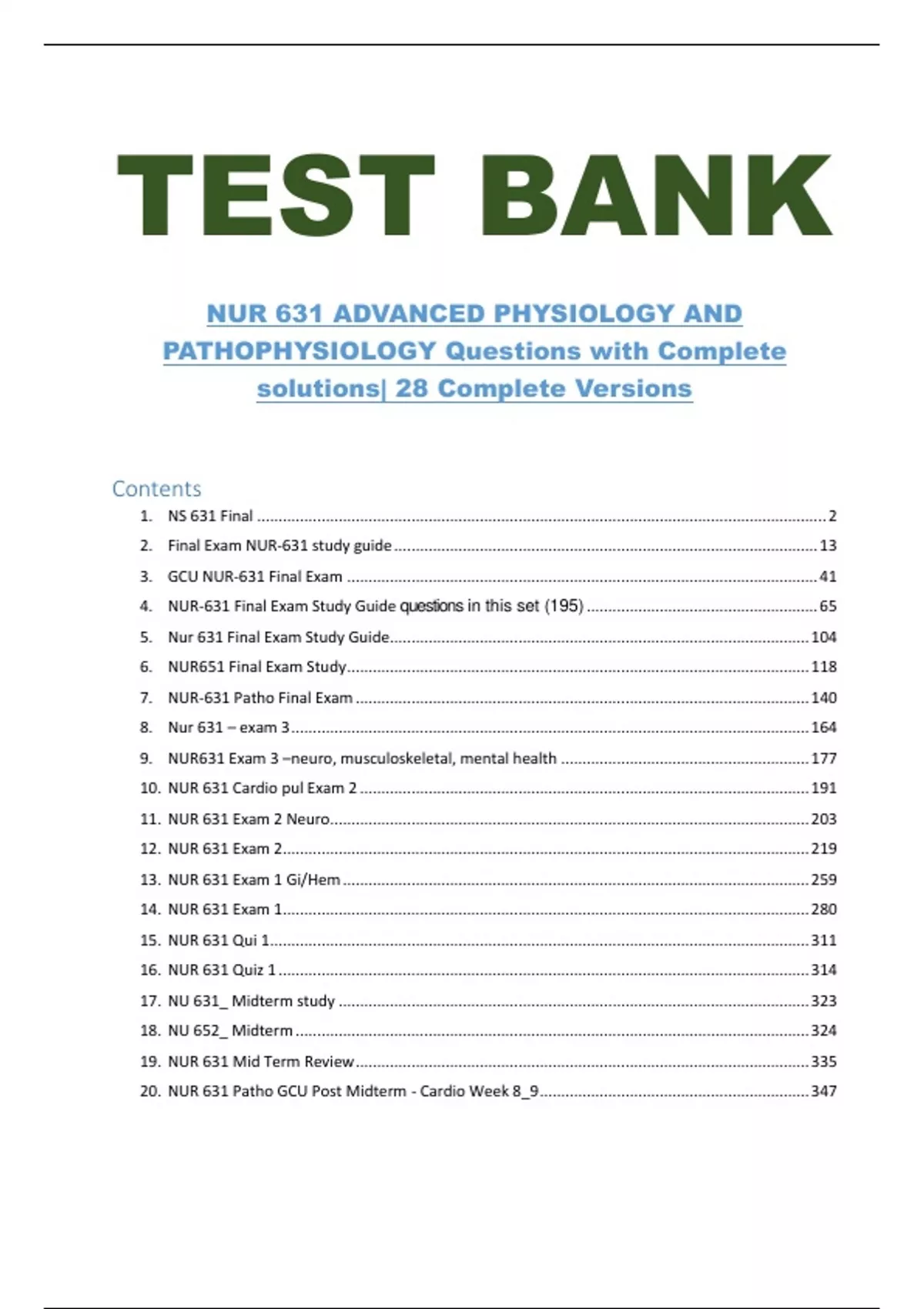 TEST BANK FOR NUR 631 ADVANCED PHYSIOLOGY AND PATHOPHYSIOLOGY Questions with Complete solutions| 28 Complete Versions