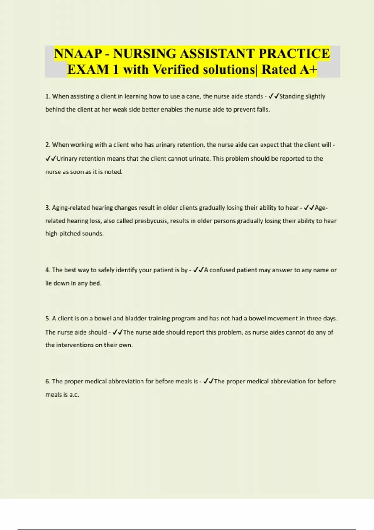 NNAAP - NURSING ASSISTANT PRACTICE EXAM 1 with Verified solutions| Rated A+