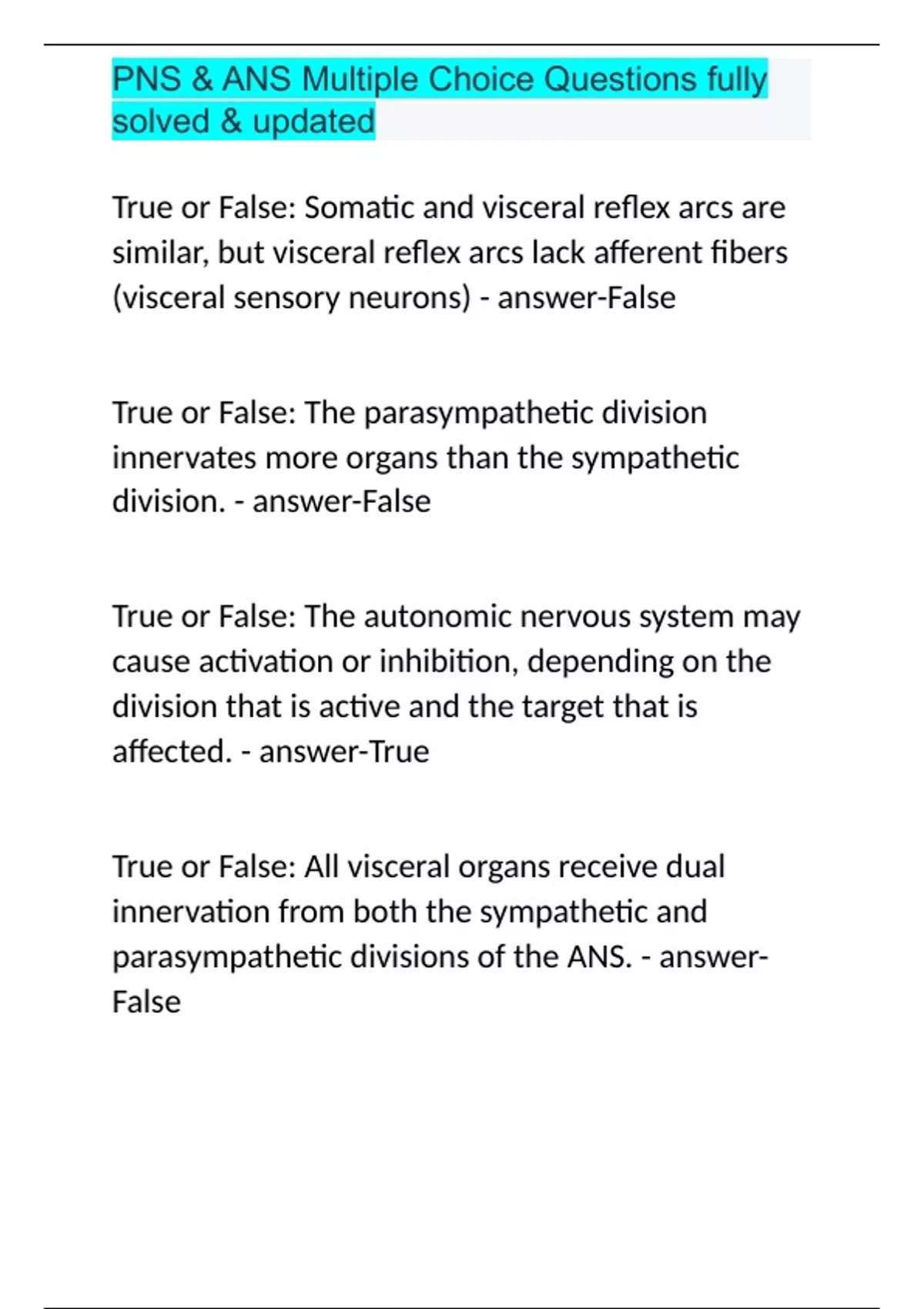 PNS & ANS Multiple Choice Questions fully solved & updated