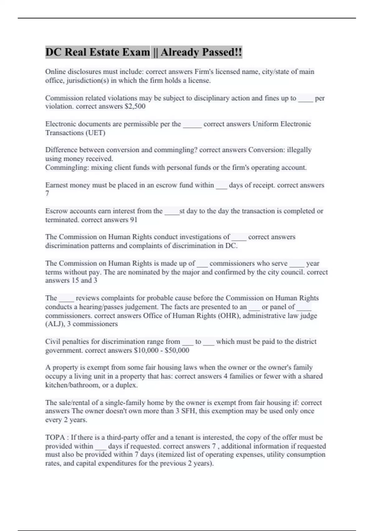 Online disclosures must include: correct answers Firm's licensed name, city/state of main office, jurisdiction(s) in which the firm holds a license. Commission related violations may be subject to disciplinary action and fines up to ____ per violation. correct answers $2,500 Electronic documents are permissible per the _____ correct answers Uniform Electronic Transactions (UET) Difference between conversion and commingling? correct answers Conversion: illegally using money received. Commingling: mixing client funds with personal funds or the firm's operating account. Earnest money must be placed in an escrow fund within ___ days of receipt. correct answers 7 Escrow accounts earn interest from the ____st day to the day the transaction is completed or terminated. correct answers 91 The Commission on Human Rights conduct investigations of ____ correct answers discrimination patterns and complaints of discrimination in DC. The Commission on Human Rights is made up of ___ commissioners who serve ____ year terms without pay. The are nominated by the major and confirmed by the city council. correct answers 15 and 3 The ____ reviews complaints for probable cause before the Commission on Human Rights conducts a hearing/passes judgement. The facts are presented to an ___ or panel of ____ commissioners. correct answers Office of Human Rights (OHR), administrative law judge (ALJ), 3 commissioners Civil penalties for discrimination range from ___ to ___ which must be paid to the district government. correct answers $10,000 - $50,000 A property is exempt from some fair housing laws when the owner or the owner's family occupy a living unit in a property that has: correct answers 4 families or fewer with a shared kitchen/bathroom, or a duplex. The sale/rental of a single-family home by the owner is exempt from fair housing if: correct answers The owner doesn't own more than 3 SFH, this exemption may be used only once every 2 years. TOPA : If there is a third-party offer and a tenant is interested, the copy of the offer must be provided within ___ days if requested. correct answers 7 , additional information if requested must also be provided within 7 days (itemized list of operating expenses, utility consumption rates, and capital expenditures for the previous 2 years).
