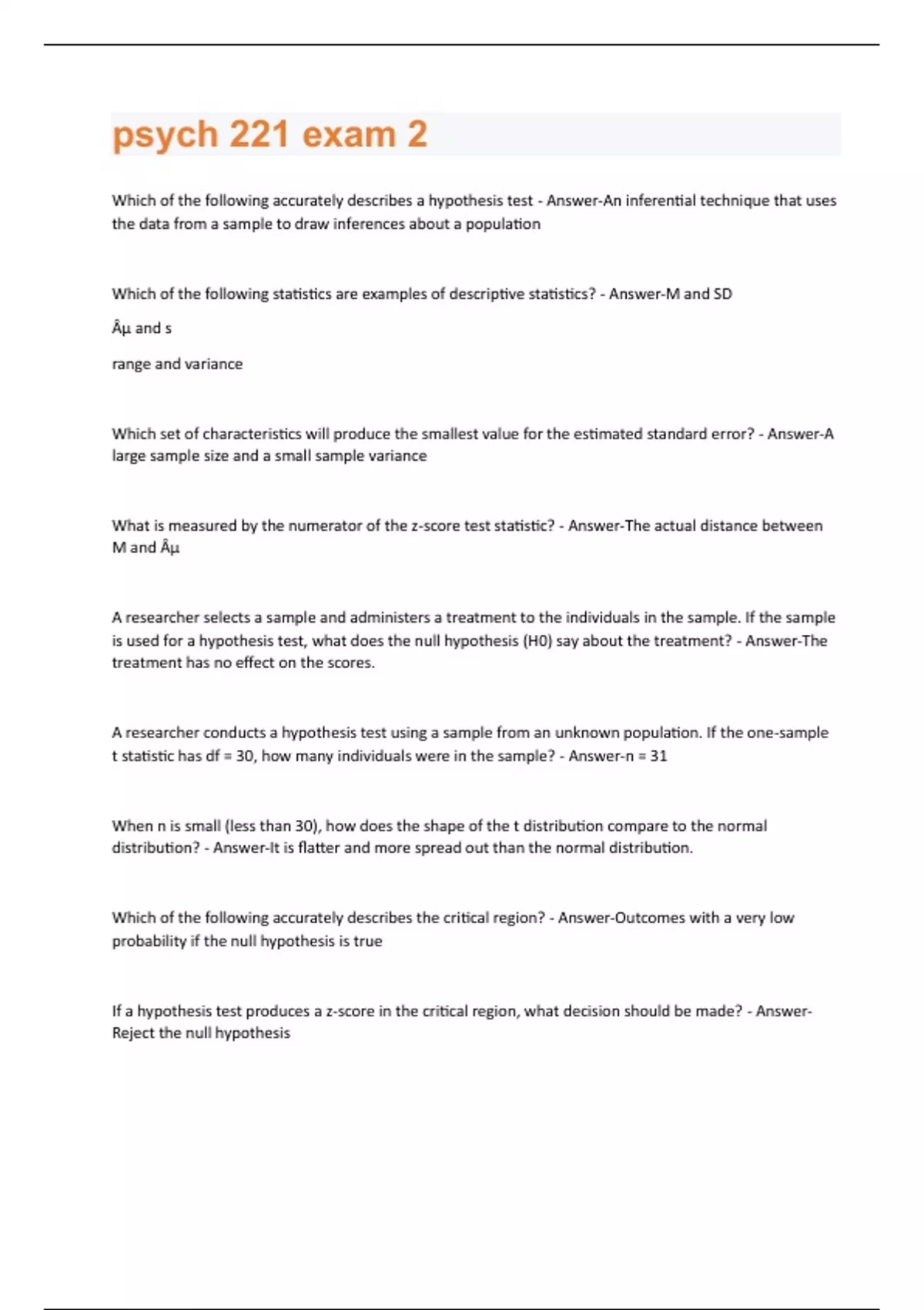 Which of the following accurately describes a hypothesis test - Answer-An inferential technique that uses the data from a sample to draw inferences about a population Which of the following statistics are examples of descriptive statistics? - Answer-M and SD µ and s range and variance Which set of characteristics will produce the smallest value for the estimated standard error? - Answer-A large sample size and a small sample variance What is measured by the numerator of the z-score test statistic? - Answer-The actual distance between M and µ A researcher selects a sample and administers a treatment to the individuals in the sample. If the sample is used for a hypothesis test, what does the null hypothesis (H0) say about the treatment? - Answer-The treatment has no effect on the scores. A researcher conducts a hypothesis test using a sample from an unknown population. If the one-sample t statistic has df = 30, how many individuals were in the sample? - Answer-n = 31 When n is small (less than 30), how does the shape of the t distribution compare to the normal distribution? - Answer-It is flatter and more spread out than the normal distribution. Which of the following accurately describes the critical region? - Answer-Outcomes with a very low probability if the null hypothesis is true If a hypothesis test produces a z-score in the critical region, what decision should be made? - AnswerReject the null hypothesisWith α = .05 and df = 8, the critical values for a two-tailed t test are t = ±2.306. Assuming all other factors are held constant, if the df value were increased to df = 20, what would happen to the critical values for t? - Answer-They would decrease (move closer to zero). Which of the following best describes a Type I error? - Answer-False positive If an effect is true in reality, but the researcher fails to find evidence for it in their sample, what error has been made? - Answer-A Type II error If other factors are held constant, what is the effect of increasing the sample size on hypothesis testing? - Answer-It will decrease the estimated standard error and increase the likelihood of rejecting H0. The denomentor in the formula for a one-sample t-test and an independent sample t-test are calculated differently, but conceptually are the same - estimated standard error. - Answer-true A one-sample t-test allows the researcher to determine whether the means in the experimental and control group differ. - Answer-false If a hypothesis test leads to rejecting the null hypothesis, it means that the sample data failed to provide sufficient evidence to conclude that the treatment has an effect. - Answer-false The results of an independent-samples t-test are reported as follows: t(15) = 2.70, p < .05. Based on this report, how many individuals were in the sample? - Answer-17 Compared to a z-score, a hypothesis test with a t statistic requires more information from the sample. - Answer-true If two samples from the same population are the same size and have the same mean, then they will have the same t statistic. - Answer-false Which of the following is a fundamental difference between the t statistic and a z-score? - Answer-The t statistic uses the sample variance in place of the population variance.In Step 2, what are the t values that create the critical region? - Answer-less than -1.98 and more than 1.98 In Step 3, what type of t-test is this? - Answer-independent t-test In Step 3, what value goes in the denominator of the t test formula? - Answer-0.2 In Step 3, what is the t-statistic? - Answer--2.5 In Step 4, what is your conclusion from the hypothesis test? - Answer-reject the null