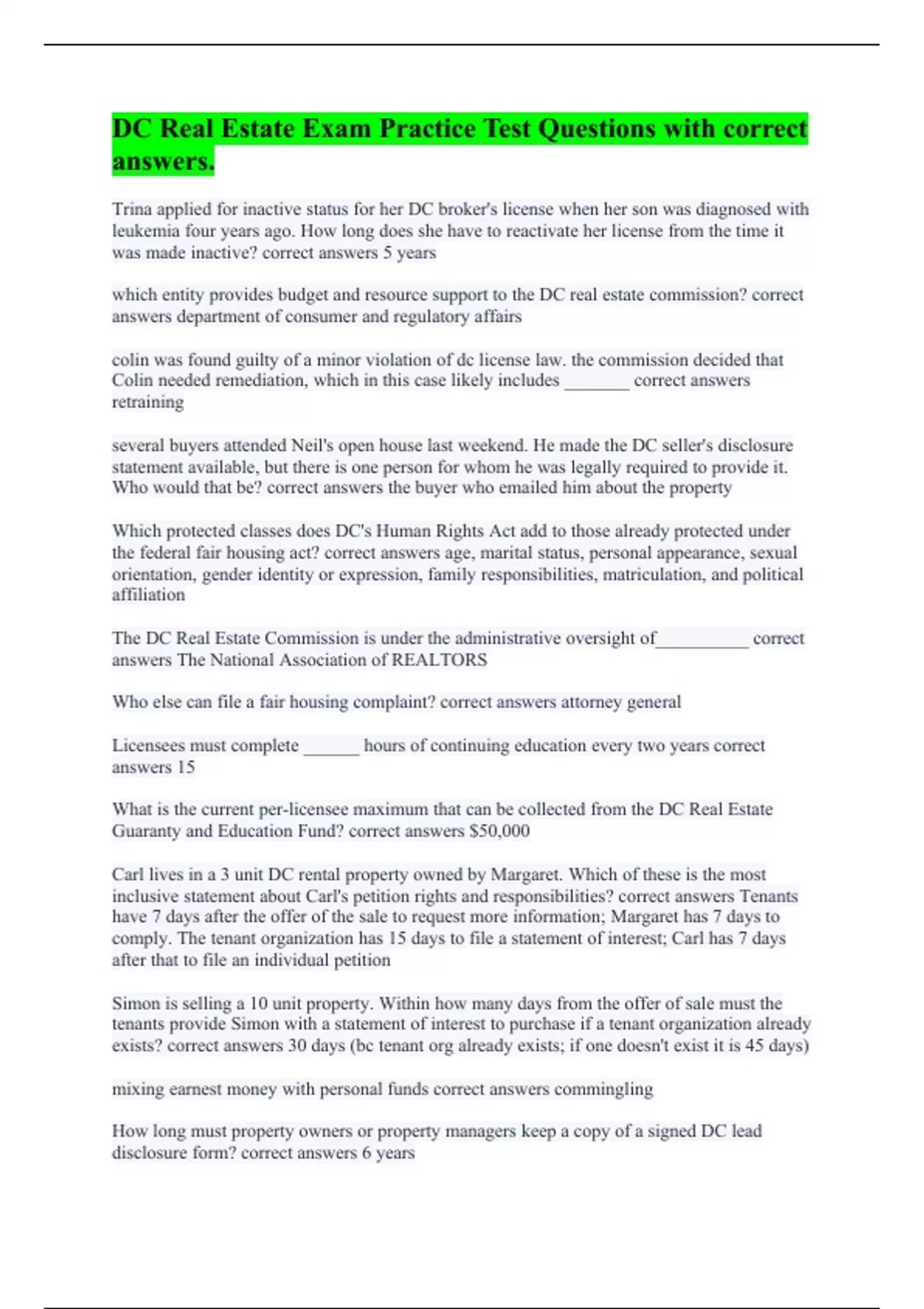 DC Real Estate Exam Practice Test Questions with correct answers.