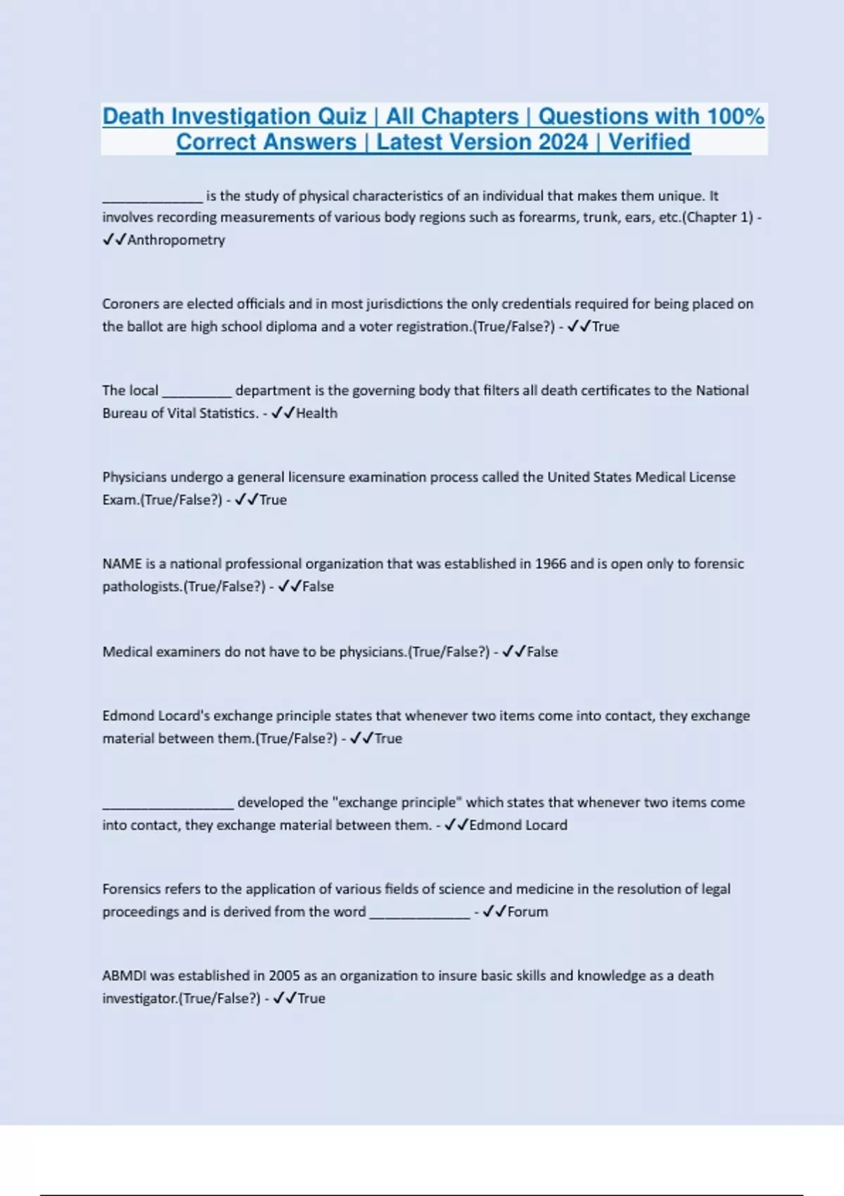 Death Investigation Quiz | All Chapters | Questions with 100% Correct Answers | Latest Version 2024 | Verified