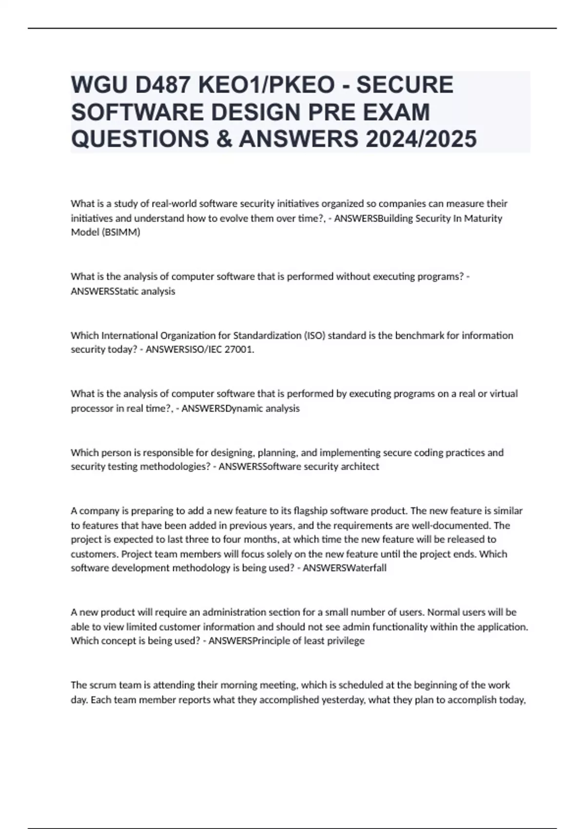 WGU D487 KEO1/PKEO - SECURE SOFTWARE DESIGN PRE EXAM QUESTIONS & ANSWERS 2024/2025