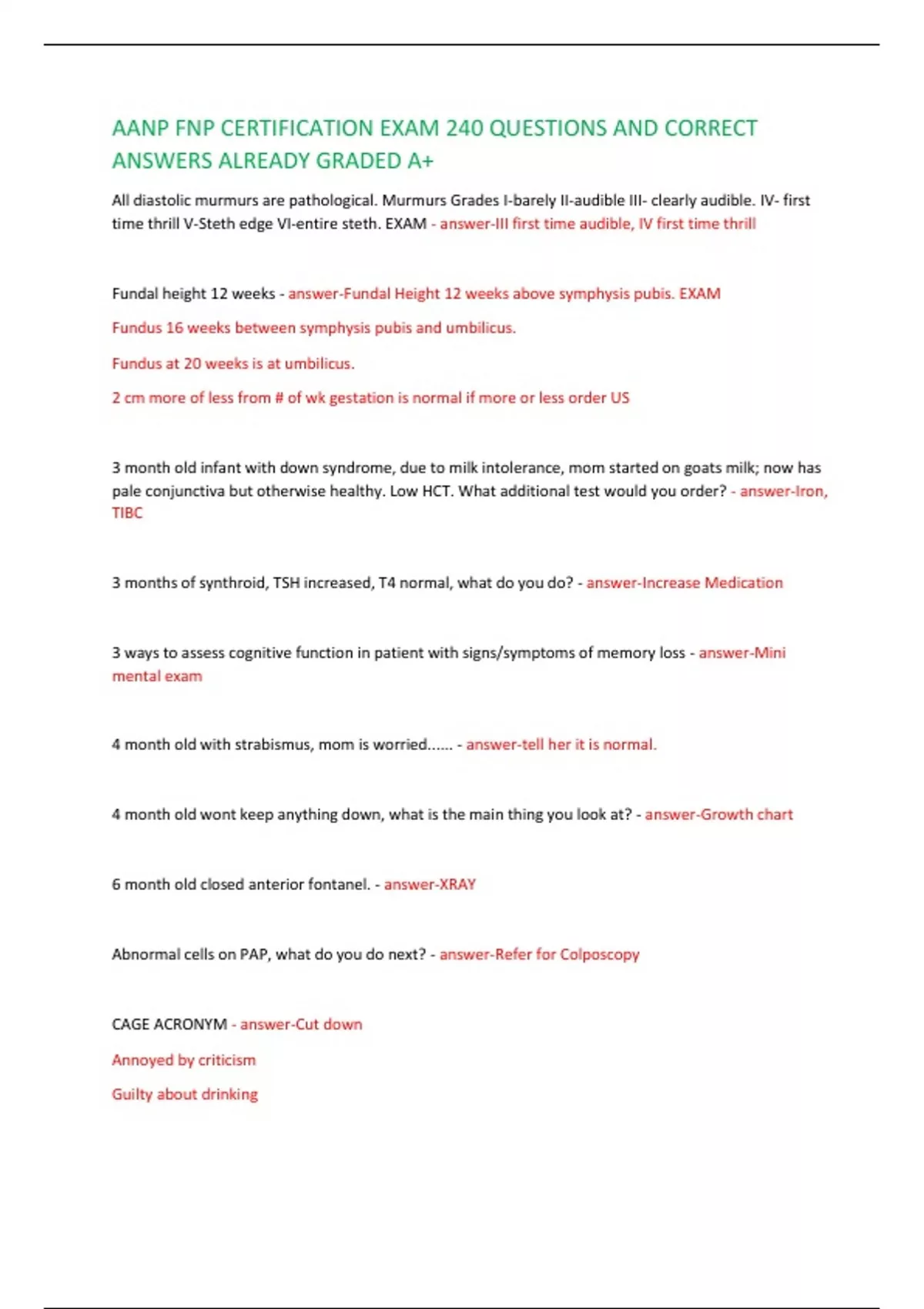 AANP FNP CERTIFICATION EXAM 240 QUESTIONS AND CORRECT ANSWERS ALREADY GRADED A+ All diastolic murmurs are pathological. Murmurs Grades I-barely II-audible III- clearly audible. IV- first time thrill V-Steth edge VI-entire steth. EXAM AANP FNP CERTIFICATION EXAM 240 QUESTIONS AND CORRECT ANSWERS ALREADY GRADED A+ All diastolic murmurs are pathological. Murmurs Grades I-barely II-audible III- clearly audible. IV- first time thrill V-Steth edge VI-entire steth. EXAM AANP FNP CERTIFICATION EXAM 240 QUESTIONS AND CORRECT ANSWERS ALREADY GRADED A+ All diastolic murmurs are pathological. Murmurs Grades I-barely II-audible III- clearly audible. IV- first time thrill V-Steth edge VI-entire steth. EXAM
