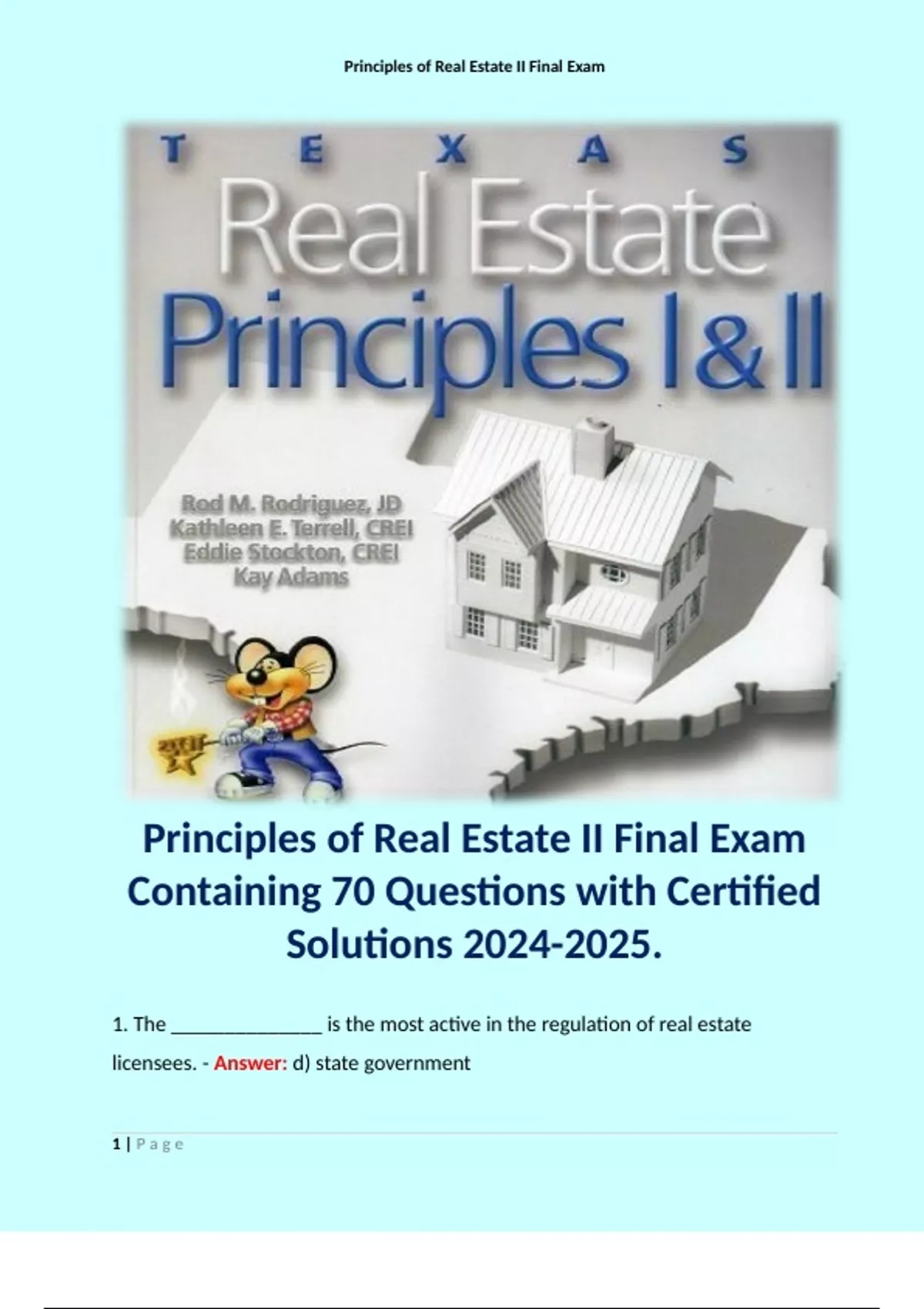Principles of Real Estate II Final Exam Containing 70 Questions with Certified Solutions .