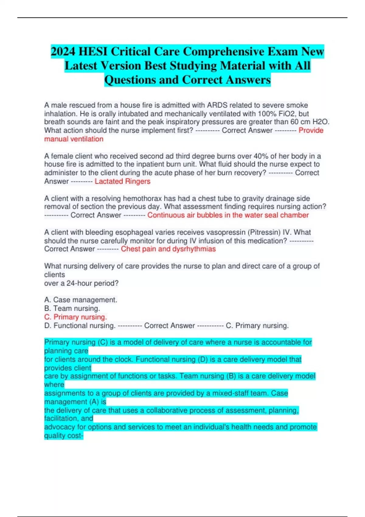 2024 HESI Critical Care Comprehensive Exam New Latest Version Best Studying Material with All Questions and Correct Answers