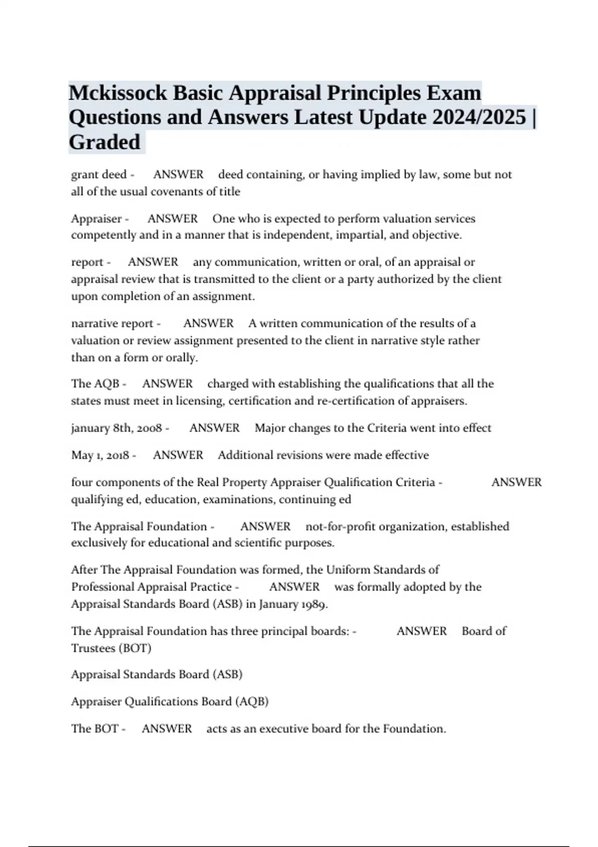 Mckissock Basic Appraisal Principles Exam Questions and Answers Latest Update 2024/2025 Graded A+. grant deed - ANSWER deed containing, or having implied by law, some but not all of the usual covenants of title Appraiser - ANSWER One who is expected to perform valuation services competently and in a manner that is independent, impartial, and objective. report - ANSWER any communication, written or oral, of an appraisal or appraisal review that is transmitted to the client or a party authorized by the client upon completion of an assignment. narrative report - ANSWER A written communication of the results of a valuation or review assignment presented to the client in narrative style rather than on a form or orally. The AQB - ANSWER charged with establishing the qualifications that all the states must meet in licensing, certification and re-certification of appraisers. january 8th, 2008 - ANSWER Major changes to the Criteria went into effect May 1, 2018 - ANSWER Additional revisions were made effective four components of the Real Property Appraiser Qualification Criteria - ANSWER qualifying ed, education, examinations, continuing ed The Appraisal Foundation - ANSWER not-for-profit organization, established exclusively for educational and scientific purposes. After The Appraisal Foundation was formed, the Uniform Standards of Professional Appraisal Practice - ANSWER was formally adopted by the Appraisal Standards Board (ASB) in January 1989. The Appraisal Foundation has three principal boards: - ANSWER Board of Trustees (BOT) Appraisal Standards Board (ASB) Appraiser Qualifications Board (AQB) The BOT - ANSWER acts as an executive board for the Foundation. Mckissock Basic Appraisal Principles Exam Questions and Answers Latest Update 2024/2025 | Graded The ASB - ANSWER responsible for creating standards for ethics and performance of appraisers. Uniform Standards of Professional Appraisal Practice (USPAP) - ANSWER was developed by the Ad Hoc Committee in 1986 and 1987 and was copyrighted in 1987 by The Appraisal Foundation. At its first meeting in 1989, the Appraisal Standards Board (ASB) - ANSWER adopted USPAP as the governing document. USPAP may be - ANSWER amended, interpreted, supplemented, or retired only by the ASB. Congress recognized USPAP - ANSWER as the generally recognized standards of practice in the appraisal profession in Title XI of the Financial Institutions Reform the Appraisal Subcommittee (ASC) - ANSWER is a federal entity with oversight authority over the state licensing and certification agencies AMCs - ANSWER appraisal management companies The Board of Trustees - ANSWER omposed of 21 individuals responsible for funding The Appraisal Foundation and appointing the members to The Appraisal Foundation's other boards - the Appraisal Standards Board and the Appraiser Qualifications Board. TAFAC - ANSWER Appraisal Foundation Advisory Council iac - ANSWER Industry Advisory Council Appraisal Standards Board - ANSWER exercises all authority and power over the subject, style, content, and substance of USPAP Appraisal Practices Board (APB) - ANSWER its purpose was to create guidance to assist appraisers in issues relating to recognized valuation methods and techniques. Even though the APB no longer exists - ANSWER The Appraisal Foundation plans to continue to issue these Valuation Advisories as it deems necessary. Appraisal Subcommittee was created - ANSWER under Section 1103 of Title XI of FIRREA HUD - ANSWER Department of Housing and Urban Development, only act on complaint with fair lending The Savings and Loan Crisis happened in the - ANSWER early 60's the appraisal foundation was established in - ANSWER 1987 The _________ monitors and reviews the practices, procedures, activities and organizational structure of The Appraisal Foundation. - ANSWER ASC the professional society that specializes in appraising personal property - ANSWER American Society of appraisers ECOA applies to all the following types of loans except - ANSWER Vacant land The ________ maintains a national registry of licensed and certified appraisors - ANSWER ASC ethics - ANSWER relating to what is good or bad: having to do with moral duty and obligation moral - ANSWER relating to the principle of right and wrong bias - ANSWER A particular preference or point of view that is personal, rather than scientific. Appraisal - ANSWER An estimate of the current value of the property. assignment - ANSWER valuation service that is provided by an appraiser as a consequence of an agreement with a client real estate - ANSWER indentified parcel or tract of land, including improvements land - ANSWER solid surface on earth as distinguished from water, one of four agents of production in economic theory Transferable Development Rights - ANSWER dev. right that cannot be used by landowner, or that landowner chooses not to use but can be conveyed to landowners in another location or leased then back to the landowner fixture - ANSWER An article that was once personal property but has since been installed or attached to the land or building in a rather permanent manner so that it is regarded in law as part of the real estate." personal property - ANSWER All property not classified as real property trade fixtures - ANSWER Personal property used in a business and can be removed by the lessee when the lease terminates. real propert - ANSWER interest in real estate (what we appraise) public restrictions - ANSWER taxation,eminent domain,police power,escheat eminent domain - ANSWER Power of a government to take private property for public use. police power - ANSWER protect public interest (zoning, building codes, subdivision regs., electrical,plumbing,energy codes) escheat - ANSWER the right of government that gives the state titular ownership of a property when its owner dies without a will or any ascertainable heirs private restrictions - ANSWER mortgages,mechanics liens,deedrestrictions,conditions covenants and restrictions mortgage - AN