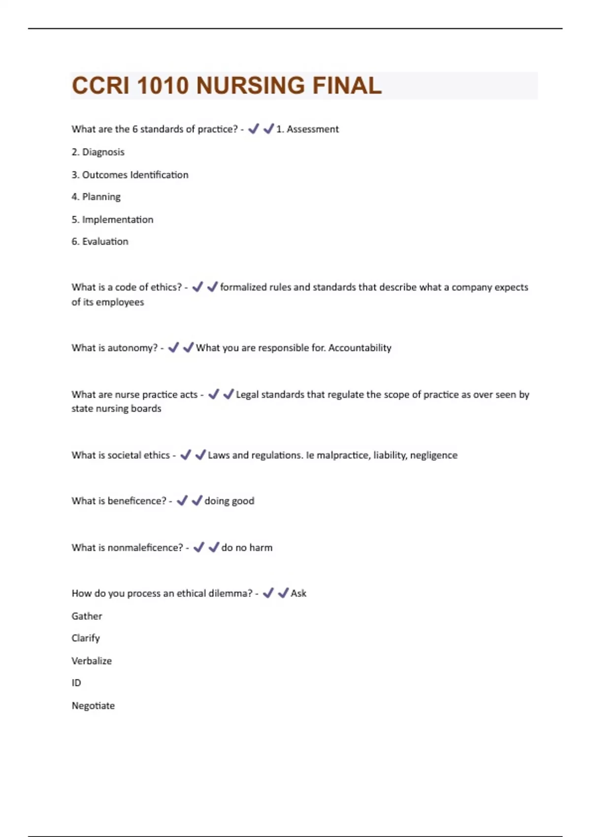 CCRI 1010 NURSING FINAL QUESTIONS & ANSWERS SOLVED 100% CORRECT!