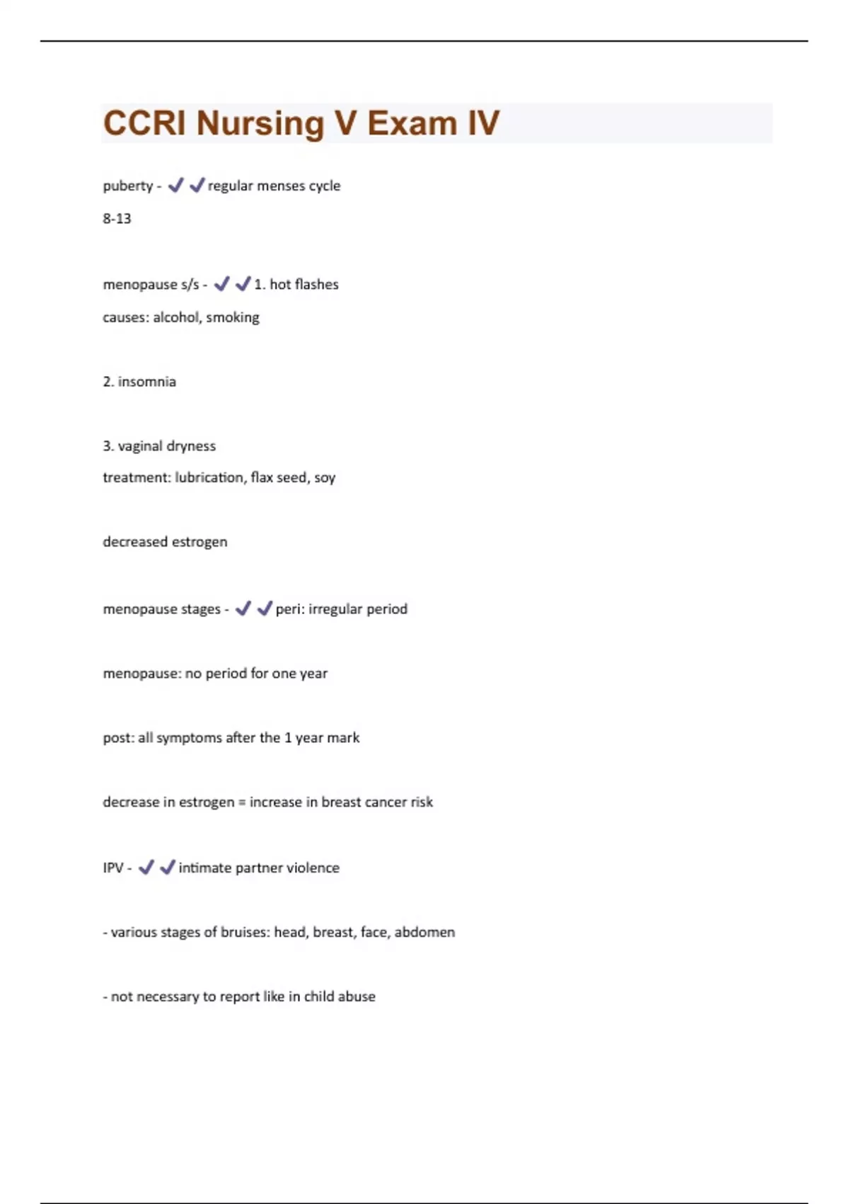 puberty - regular menses cycle 8-13 menopause s/s - 1. hot flashes causes: alcohol, smoking 2. insomnia 3. vaginal dryness treatment: lubrication, flax seed, soy decreased estrogen menopause stages - peri: irregular period menopause: no period for one year post: all symptoms after the 1 year mark decrease in estrogen = increase in breast cancer risk IPV - intimate partner violence - various stages of bruises: head, breast, face, abdomen - not necessary to report like in child abuse- document amenorrhea - - no menses, hips, hair , breasts by 13 - congenital anomalies ( no vagina or ovaries ) runs in the family - lack of LH, FSH emotional support, hormone replacement secondary amenorrhea - - no meses for 6 months after she has had normal mess - assess for pregnancy causes: eating disorder, emotional stress, extensive exercise hypgonadotropic amenorrhea - emotional stress assess for pregnancy limited production of LH, FSH primary dysmenorrhea - Pain cause: too many prostaglandins 24 hours before onset and lasts for 12-24 hours after nausea, HA diarrhea give: prostaglandin inhibitors ( NSAIDS), BC, warm bath, heat, exercise secondary dysmenorrhea - Causes:- PID, uterine fibroids give: NSAIDS, warm baths menorrhagia - bleeding - women with fibroids, cancer - imbalance with estrogen and progesterone Nursing: endometrial biopsy, remove IUD, give BC ferrous sulfate - 324 mg - iron supplement - constipating eat high fiber, drink a lot of fluid, laxative metrorrhagia - bleeding between periods or after menopause - cancerous sign chlamydia - - can cause premature rupture of membranes ( risk to fetus) - post partum endometriosis s/s : asymptomatic or fever, vaginal spotting, painful intercourse dx: vaginal culture antibiotics : azithromyocinGonorrhea - high risk for: - miscarriage if active during pregnancy - premature rupture of membranes - preterm labor and birth - infection of membranes ( chorioamniitis ) - fetal demise , IUGR s/s: vaginal discharge, bleeding post coital, low back pain, UTI, antibiotics: IM ceftriaxone (one dose) then give doxycycline for 7 days syphilis - risk for : - miscarriage - preterm labor /birth - congenital anomalies - IUGR 3 stages 1. primary: single painless ulcer at point of contact 4-6 weeks then goes dormant. 2. secondary: 6 weeks - 6 months ulcer will return. fever, sore throat, weight loss, fatigue then goes dormant 3. tertiary: liver, kidney, neuro dysfunction penicillin PID - upper genital, uterus, ovaries, perineum- infertility - ectopic pregnancies ( adhesions in fallopian tubes) cause: have recurrent STI's , intrauterine device s/s: abdominal pain, irregular menses, abnormal discharge, painful sex, fever, high white counts dx: intrauterine biopsy tx: dependent on cultures trichomoniasis - - asymptomatic , 8-25 days will have symptoms - grey, green vaginal discharge - pain during sex - red ulcers in vagina tx: flagyl ( GI upset) - no alcohol HPV - - labor dystocia - painless growth on vagina: lesions can cause PPH herpes - intrauterine infection - congenital abnormalities in baby - itching, burning - stays with youactive herpes: cannot give birth vaginally tx: acyclovir Hep C - CAN vaginally delivery no proof it crosses into breast milk HIV - night sweats weight loss abnormal periods nursing: use PPE no breast feeding can have vaginal birth Bacterial vaginosis - risk factors: new partners , multiple partners, same sex / toys, douching, antibiotics s/s : odor/ discharge dx: culture , vaginal assessment nursing: - drink water - eat yogurt/ probiotics flagyl, clindomyocin, monistat,Group Beta Strep ( GBS) - 36 weeks: culture and screen moms high concentrations: risk of .. - UTI - choreoaminitis - post partum endometriosis -preterm labor/ birth