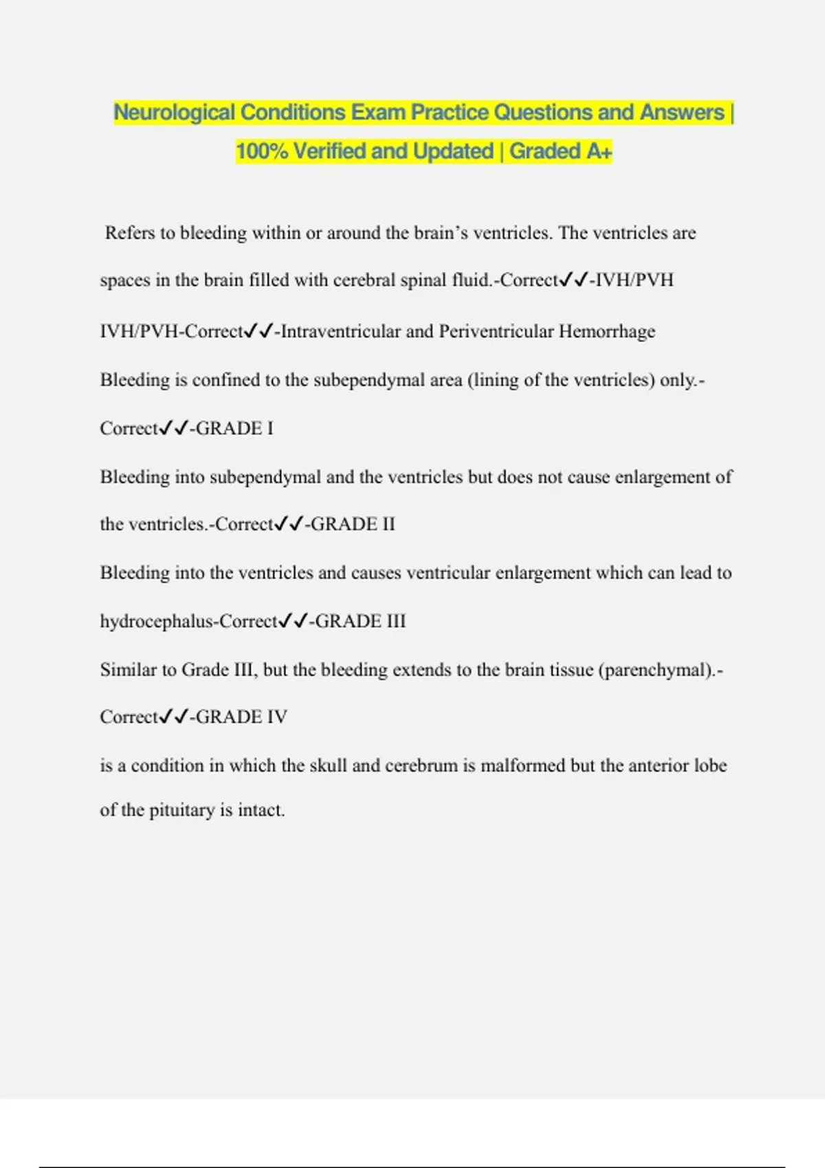 Neurological Conditions Exam Practice Questions and Answers | 100% Verified and Updated | Graded A+ Refers to bleeding within or around the brain’s ventricles. The ventricles are spaces in the brain filled with cerebral spinal fluid.-Correct️️ -IVH/PVH IVH/PVH-Correct️️ -Intraventricular and Periventricular Hemorrhage Bleeding is confined to the subependymal area (lining of the ventricles) only.- Correct️️ -GRADE I Bleeding into subependymal and the ventricles but does not cause enlargement of the ventricles.-Correct️️ -GRADE II Bleeding into the ventricles and causes ventricular enlargement which can lead to hydrocephalus-Correct️️ -GRADE III Similar to Grade III, but the bleeding extends to the brain tissue (parenchymal).- Correct️️ -GRADE IV is a condition in which the skull and cerebrum is malformed but the anterior lobe of the pituitary is intact. an’, which means ‘without,’ and the Greek word ‘enkephalos,’ which means ‘brain’.-Correct️️ -ANENCEPAHLY A neural tube defect that is noticeable at birth because there is a protrusion of the brain through a skull defect.-Correct️️ -ENCEPHALOCELE it is a supplement during pregnancy that can help reduce the risk of encephalocele.- Correct️️ -Folic acid (B₉) is a rare condition in which the frontal occipital circumference (FOC) is equal to or less than two standard deviations below the mean for age and gender or less than the 10th percentile for gestational age.-Correct️️ -MICROCEPAHLY There are two types of microcephaly:-Correct️️ -PRIMARY OR CONGENITAL SECONDARY OR ACQUIRED The baby is born with a smaller head.-Correct️️ -PRIMARY OR CONGENITAL The condition develops as the baby gets older.-Correct️️ -SECONDARY OR ACQUIRED is a condition that changes the way a baby’s brain develops.-Correct️️ - HOLOPROSENCEPHALY HPE-Correct️️ -HOLOPROSENCEPHALY There are 3 types of HPE:-Correct️️ -ALOB