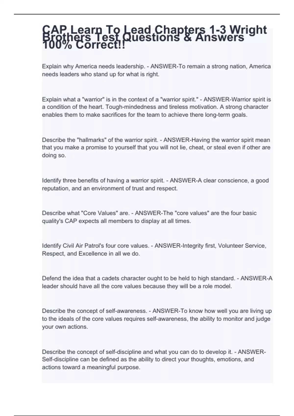 Explain why America needs leadership. - ANSWER-To remain a strong nation, America needs leaders who stand up for what is right. Explain what a "warrior" is in the context of a "warrior spirit." - ANSWER-Warrior spirit is a condition of the heart. Tough-mindedness and tireless motivation. A strong character enables them to make sacrifices for the team to achieve there long-term goals. Describe the "hallmarks" of the warrior spirit. - ANSWER-Having the warrior spirit mean that you make a promise to yourself that you will not lie, cheat, or steal even if other are doing so. Identify three benefits of having a warrior spirit. - ANSWER-A clear conscience, a good reputation, and an environment of trust and respect. Describe what "Core Values" are. - ANSWER-The "core values" are the four basic quality's CAP expects all members to display at all times. Identify Civil Air Patrol's four core values. - ANSWER-Integrity first, Volunteer Service, Respect, and Excellence in all we do. Defend the idea that a cadets character ought to be held to high standard. - ANSWER-A leader should have all the core values because they will be a role model. Describe the concept of self-awareness. - ANSWER-To know how well you are living up to the ideals of the core values requires self-awareness, the ability to monitor and judge your own actions.