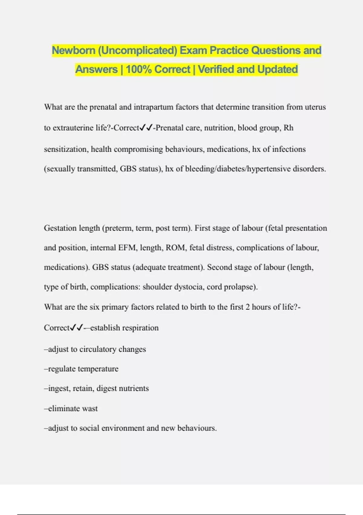 Newborn (Uncomplicated) Exam Practice Questions and Answers | 100% Correct | Verified and Updated