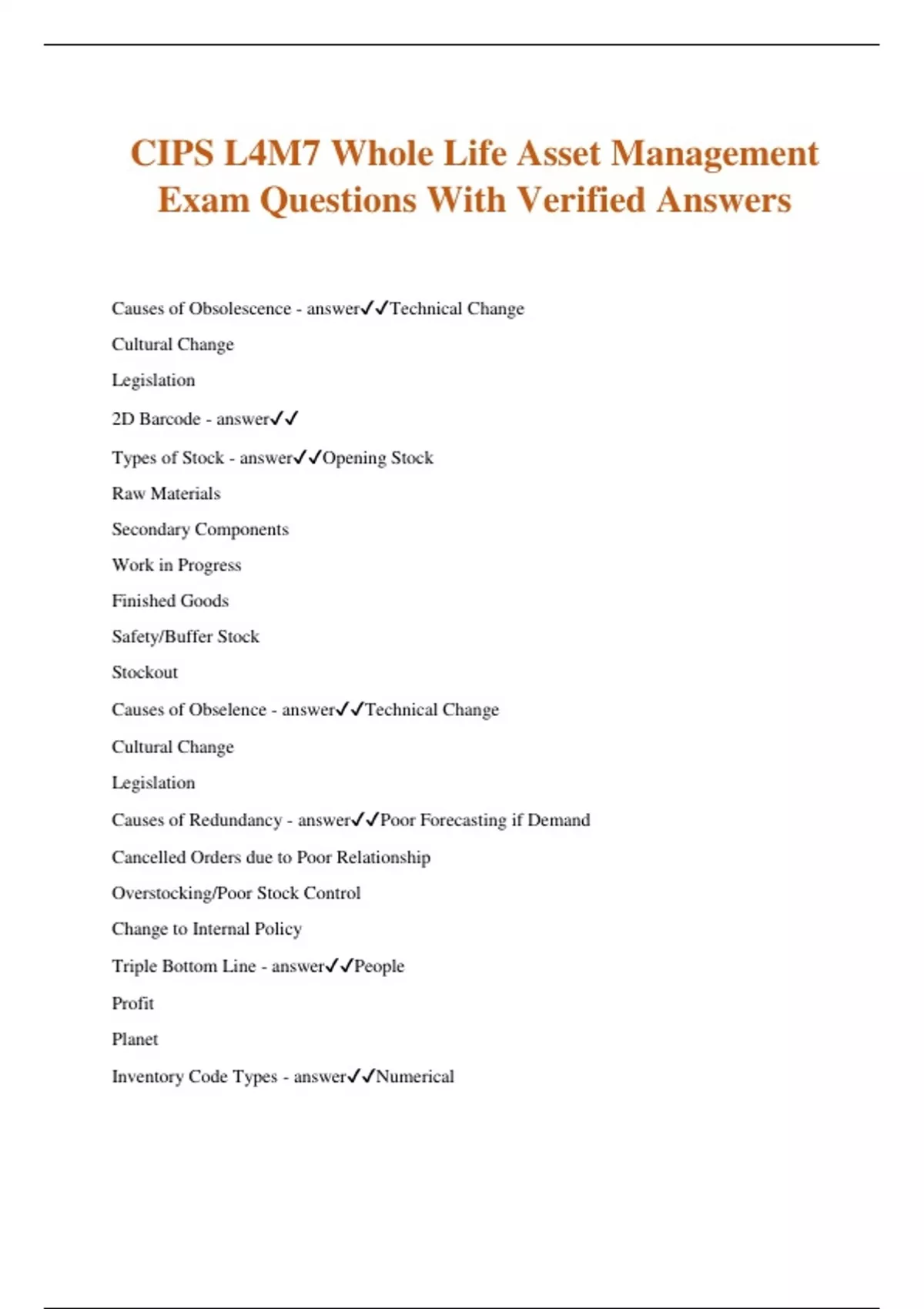 CIPS L4M7 Whole Life Asset Management Exam Questions With Verified Answers Causes of Obsolescence - answerTechnical Change Cultural Change Legislation 2D Barcode - answer Types of Stock - answerOpening Stock Raw Materials Secondary Components Work in Progress Finished Goods Safety/Buffer Stock Stockout Causes of Obselence - answerTechnical Change Cultural Change Legislation Causes of Redundancy - answerPoor Forecasting if Demand Cancelled Orders due to Poor Relationship Overstocking/Poor Stock Control Change to Internal Policy Triple Bottom Line - answerPeople Profit Planet Inventory Code Types - answerNumerical