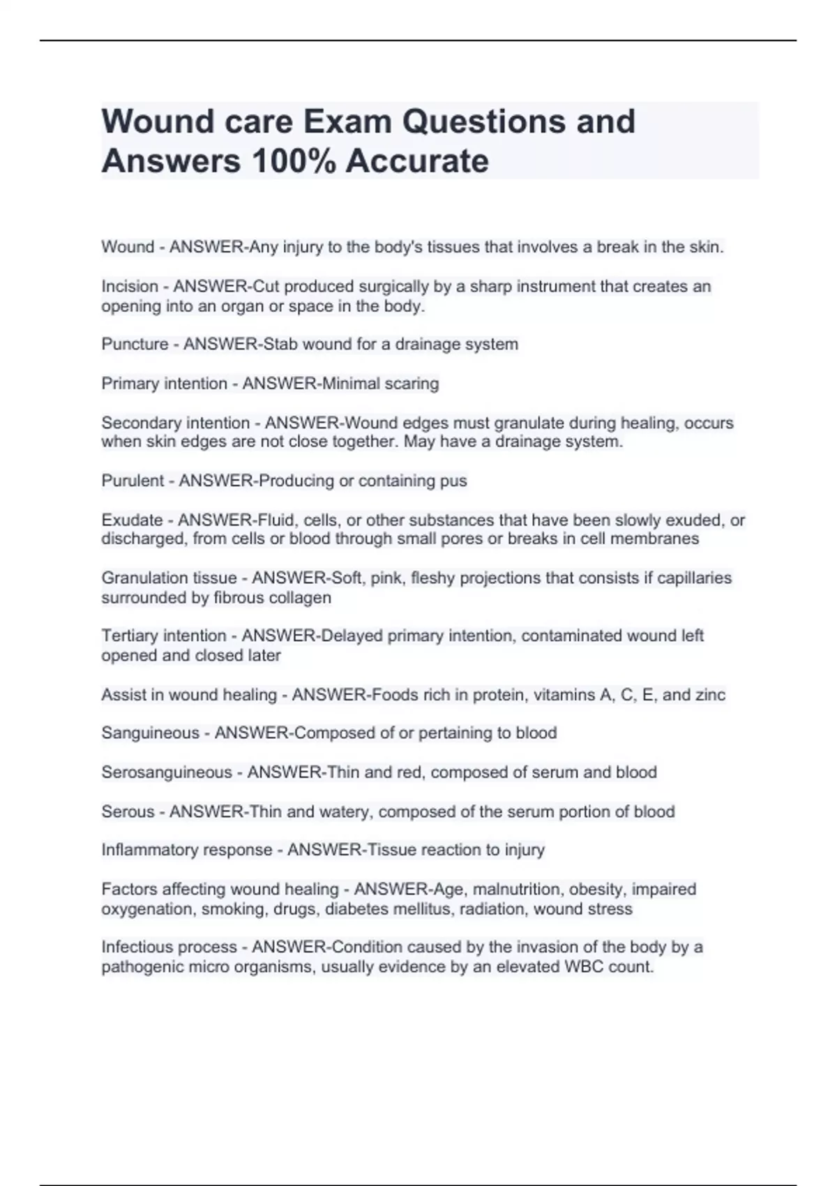 Wound care Exam Questions and Answers 100% AccurateWound care Exam Questions and Answers 100% AccurateWound care Exam Questions and Answers 100% AccurateWound care Exam Questions and Answers 100% Accurate Wound - ANSWER-Any injury to the body's tissues that involves a break in the skin. Incision - ANSWER-Cut produced surgically by a sharp instrument that creates an opening into an organ or space in the body. Puncture - ANSWER-Stab wound for a drainage system