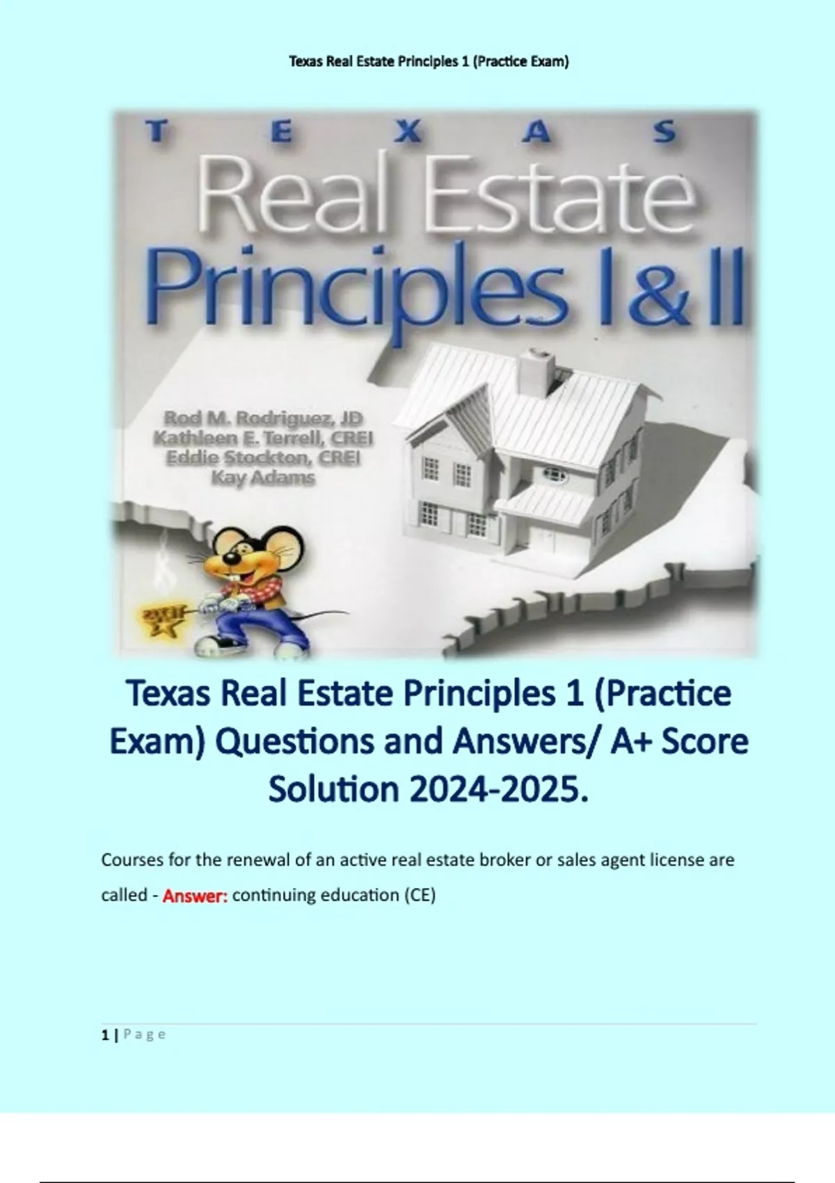 Texas Real Estate Principles 1 (Practice Exam) Questions and Answers/ A+ Score Solution . Terms like: Courses for the renewal of an active real estate broker or sales agent license are called - Answer: continuing education (CE)