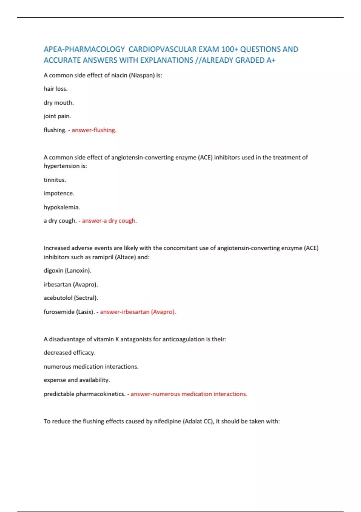 APEA-PHARMACOLOGY CARDIOPVASCULAR EXAM 100+ QUESTIONS AND ACCURATE ANSWERS WITH EXPLANATIONS //ALREADY GRADED A+ A common side effect of niacin (Niaspan) is: APEA-PHARMACOLOGY CARDIOPVASCULAR EXAM 100+ QUESTIONS AND ACCURATE ANSWERS WITH EXPLANATIONS //ALREADY GRADED A+ A common side effect of niacin (Niaspan) is: APEA-PHARMACOLOGY CARDIOPVASCULAR EXAM 100+ QUESTIONS AND ACCURATE ANSWERS WITH EXPLANATIONS //ALREADY GRADED A+ A common side effect of niacin (Niaspan) is:
