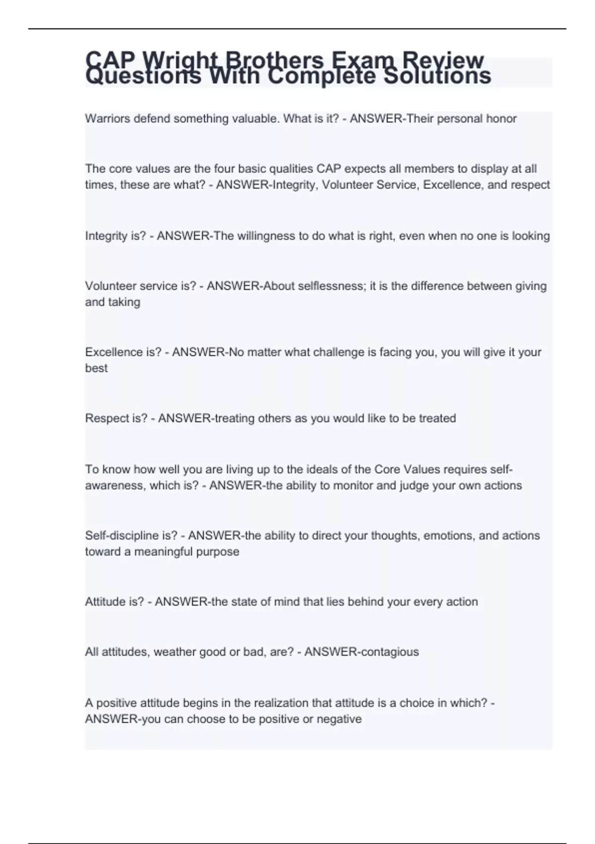 Warriors defend something valuable. What is it? - ANSWER-Their personal honor The core values are the four basic qualities CAP expects all members to display at all times, these are what? - ANSWER-Integrity, Volunteer Service, Excellence, and respect Integrity is? - ANSWER-The willingness to do what is right, even when no one is looking Volunteer service is? - ANSWER-About selflessness; it is the difference between giving and taking Excellence is? - ANSWER-No matter what challenge is facing you, you will give it your best Respect is? - ANSWER-treating others as you would like to be treated To know how well you are living up to the ideals of the Core Values requires self-awareness, which is? - ANSWER-the ability to monitor and judge your own actions Self-discipline is? - ANSWER-the ability to direct your thoughts, emotions, and actions toward a meaningful purpose Attitude is? - ANSWER-the state of mind that lies behind your every action All attitudes, weather good or bad, are? - ANSWER-contagious A positive attitude begins in the realization that attitude is a choice in which? - ANSWER-you can choose to be positive or negative