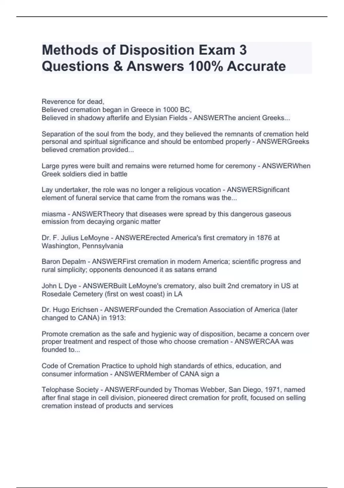 Methods of Disposition Exam 3 Questions & Answers 100% AccurateMethods of Disposition Exam 3 Questions & Answers 100% AccurateMethods of Disposition Exam 3 Questions & Answers 100% AccurateMethods of Disposition Exam 3 Questions & Answers 100% Accurate Reverence for dead, Believed cremation began in Greece in 1000 BC, Believed in shadowy afterlife and Elysian Fields - ANSWERThe ancient Greeks... Separation of the soul from the body, and they believed the remnants of cremation held personal and spiritual significance and should be entombed properly - ANSWERGreeks believed cremation provided... Large pyres were built and remains were returned home for ceremony - ANSWERWhen Greek soldiers died in battle