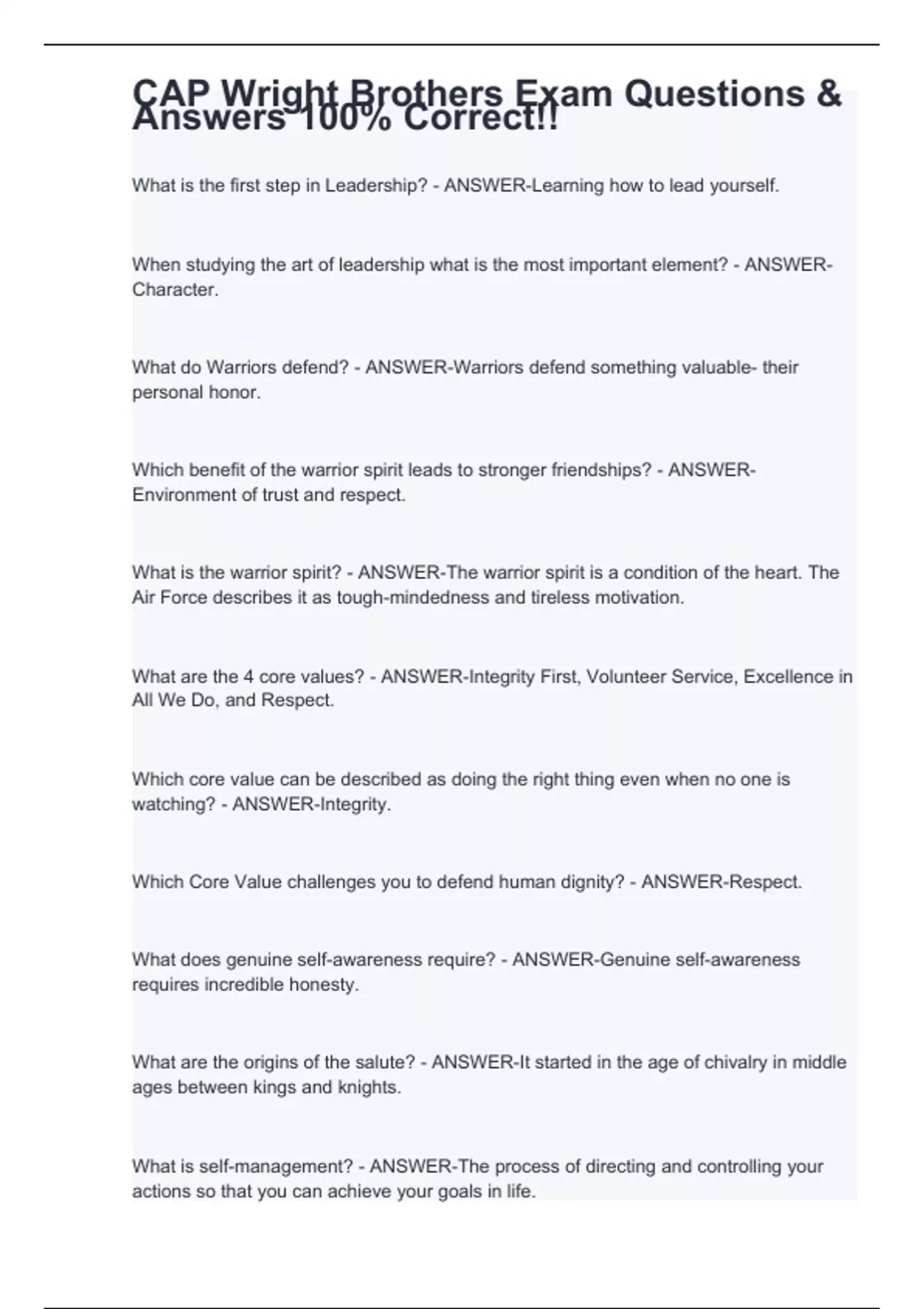 When studying the art of leadership what is the most important element? - ANSWER-Character. What do Warriors defend? - ANSWER-Warriors defend something valuable- their personal honor. Which benefit of the warrior spirit leads to stronger friendships? - ANSWER-Environment of trust and respect. What is the warrior spirit? - ANSWER-The warrior spirit is a condition of the heart. The Air Force describes it as tough-mindedness and tireless motivation. What are the 4 core values? - ANSWER-Integrity First, Volunteer Service, Excellence in All We Do, and Respect. Which core value can be described as doing the right thing even when no one is watching? - ANSWER-Integrity. Which Core Value challenges you to defend human dignity? - ANSWER-Respect. What does genuine self-awareness require? - ANSWER-Genuine self-awareness requires incredible honesty. What are the origins of the salute? - ANSWER-It started in the age of chivalry in middle ages between kings and knights.