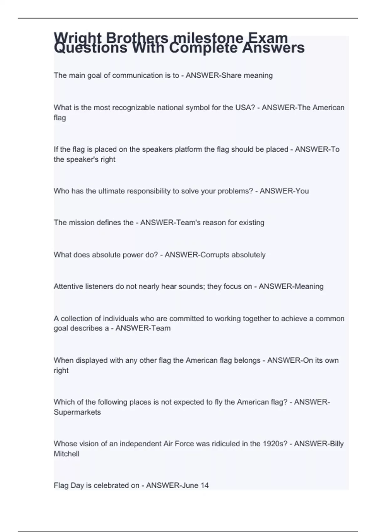 What is the most recognizable national symbol for the USA? - ANSWER-The American flag If the flag is placed on the speakers platform the flag should be placed - ANSWER-To the speaker's right Who has the ultimate responsibility to solve your problems? - ANSWER-You The mission defines the - ANSWER-Team's reason for existing What does absolute power do? - ANSWER-Corrupts absolutely Attentive listeners do not nearly hear sounds; they focus on - ANSWER-Meaning A collection of individuals who are committed to working together to achieve a common goal describes a - ANSWER-Team When displayed with any other flag the American flag belongs - ANSWER-On its own right Which of the following places is not expected to fly the American flag? - ANSWER-Supermarkets Whose vision of an independent Air Force was ridiculed in the 1920s? - ANSWER-Billy Mitchell