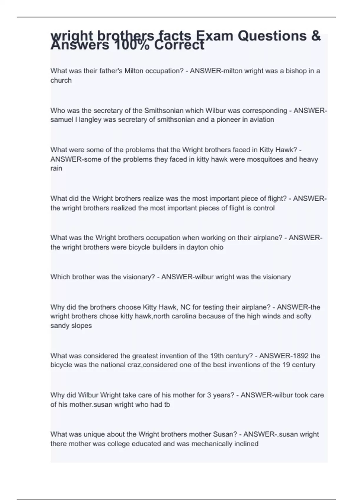 Who was the secretary of the Smithsonian which Wilbur was corresponding - ANSWER-samuel l langley was secretary of smithsonian and a pioneer in aviation What were some of the problems that the Wright brothers faced in Kitty Hawk? - ANSWER-some of the problems they faced in kitty hawk were mosquitoes and heavy rain What did the Wright brothers realize was the most important piece of flight? - ANSWER-the wright brothers realized the most important pieces of flight is control What was the Wright brothers occupation when working on their airplane? - ANSWER-the wright brothers were bicycle builders in dayton ohio Which brother was the visionary? - ANSWER-wilbur wright was the visionary Why did the brothers choose Kitty Hawk, NC for testing their airplane? - ANSWER-the wright brothers chose kitty hawk,north carolina because of the high winds and softy sandy slopes What was considered the greatest invention of the 19th century? - ANSWER-1892 the bicycle was the national craz,considered one of the best inventions of the 19 century Why did Wilbur Wright take care of his mother for 3 years? - ANSWER-wilbur took care of his wright who had tb