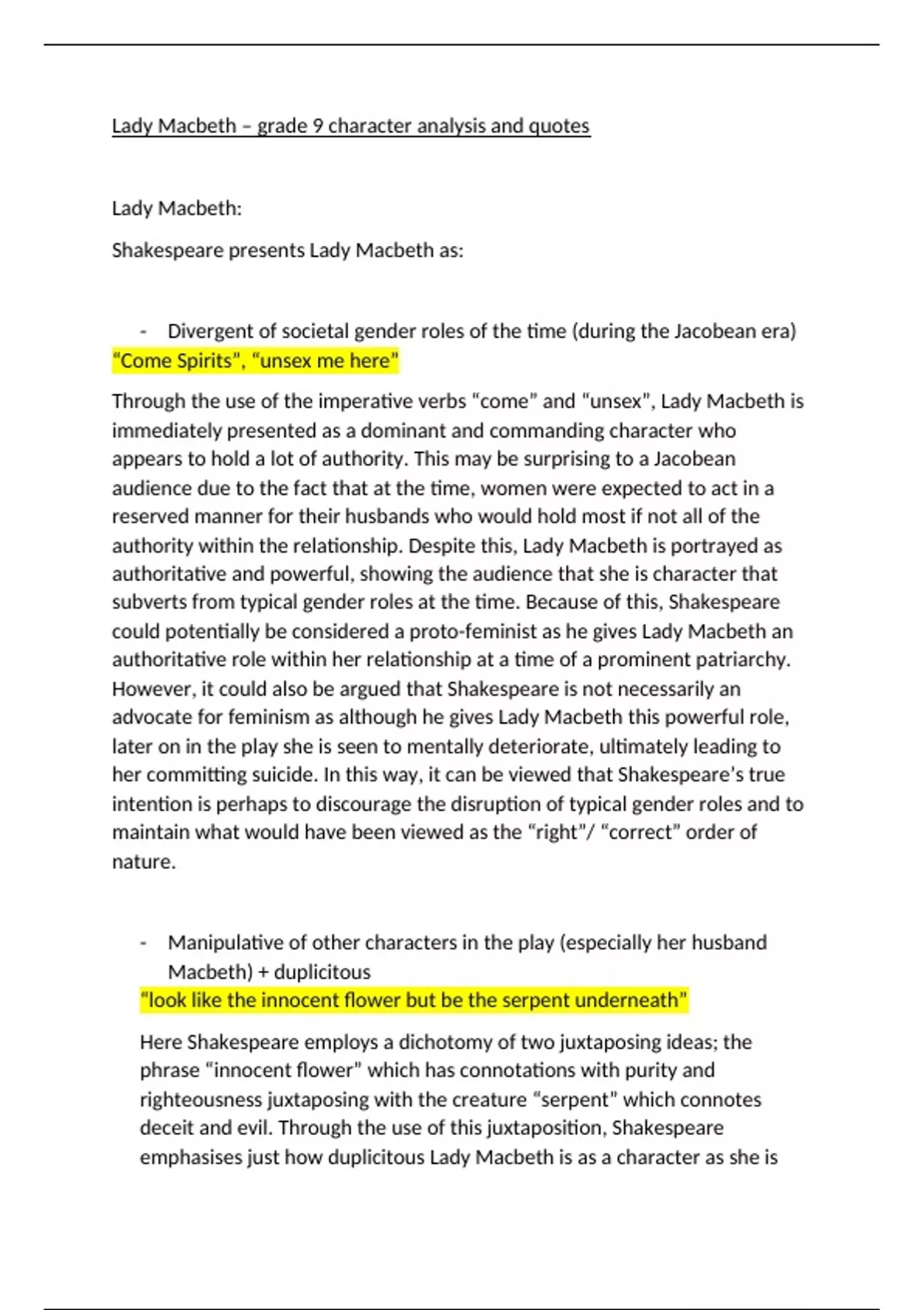 This document contains the perceptive quotes and character analysis for Lady Macbeth that were used by my GCSE students to achieve grade 9s within their English literature exams. Each point includes unique analysis and contextual information.