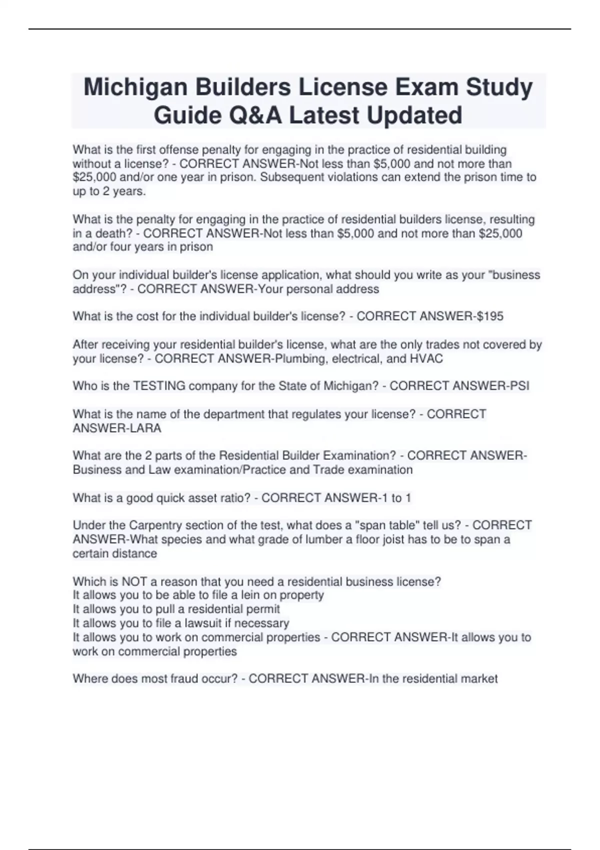 Michigan Builders License Exam Study Guide Q&A Latest Updated What is the first offense penalty for engaging in the practice of residential building without a license? - CORRECT ANSWER-Not less than $5,000 and not more than $25,000 and/or one year in prison. Subsequent violations can extend the prison time to up to 2 years. What is the penalty for engaging in the practice of residential builders license, resulting in a death? - CORRECT ANSWER-Not less than $5,000 and not more than $25,000 and/or four years in prison On your individual builder's license application, what should you write as your "business address"? - CORRECT ANSWER-Your personal address What is the cost for the individual builder's license? - CORRECT ANSWER-$195 After receiving your residential builder's license, what are the only trades not covered by your license? - CORRECT ANSWER-Plumbing, electrical, and HVAC Who is the TESTING company for the State of Michigan? - CORRECT ANSWER-PSI What is the name of the department that regulates your license? - CORRECT ANSWER-LARA What are the 2 parts of the Residential Builder Examination? - CORRECT ANSWERBusiness and Law examination/Practice and Trade examination What is a good quick asset ratio? - CORRECT ANSWER-1 to 1 Under the Carpentry section of the test, what does a "span table" tell us? - CORRECT ANSWER-What species and what grade of lumber a floor joist has to be to span a certain distance Which is NOT a reason that you need a residential business license? It allows you to be able to file a lein on property It allows you to pull a residential permit It allows you to file a lawsuit if necessary It allows you to work on commercial properties - CORRECT ANSWER-It allows you to work on commercial properties Where does most fraud occur? - CORRECT ANSWER-In the residential market As a builder, your license falls under the regulation of: - CORRECT ANSWER-Both rules by the director and board as well as laws of the state of Michigan What is the make up of the 9 members of the board? - CORRECT ANSWER-4 residential builders, 2 M + A contractors, and 3 members of the general public Under the definition of occupational code, what does the word "limitation" refer to? - CORRECT ANSWER-A condition, stricture, restraint or probation attached to a license relative to the scope of practice Who, upon completion of a hearing, shall assess a penalty or penalties? - CORRECT ANSWER-The Board If you fail to renew your license or registration on or before the expiration date, how many days do you have to resubmit with the proper payment and late fee? - CORRECT ANSWER-60 days When the department is investigating a complaint and finds evidence of a violation, what actions can be brought against the respondent? - CORRECT ANSWER-A cease and desist order, a formal complaint, and/or a citation How many days after the administrative law hearings examiner hears the report, must a determination of penalties be made by the board? - CORRECT ANSWER-60 days What is a compliance conference? - CORRECT ANSWER-A meeting where ONLY the respondent meets with the department to discuss the complaint against them Which of the following terms means a premise used or intended to be used for a residential purpose and related facilities appurtenant to the premises used or intended to be used as an adjunct of residential occupancy? - CORRECT ANSWER-Residential structure An employee other than the listed salesperson may make a sale when: - CORRECT ANSWER-It is occasional and incidental to the person's principal employment The following are reasons that someone would be allowed to operate without a residential business license: - CORRECT ANSWER-- They are an authorized representative of the United States government - They are the owner of a rental property with reference to the maintenance and alteration of that rental property - An owner of property with reference to a structure on the property for the owner's own use and occupancy Beginning the license cycle after December 21, 2007, the department shall issue the license of a residential builder and residential maintenance and alteration contractor for a period of how many years in durat