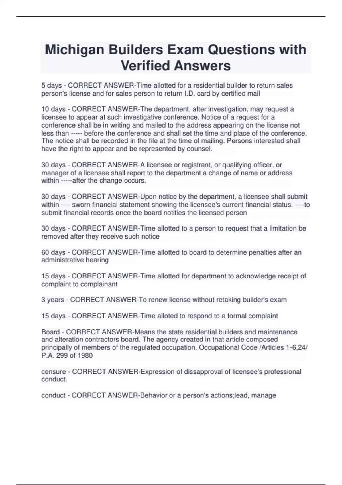 Michigan Builders Exam Questions with Verified Answers 5 days - CORRECT ANSWER-Time allotted for a residential builder to return sales person's license and for sales person to return I.D. card by certified mail 10 days - CORRECT ANSWER-The department, after investigation, may request a licensee to appear at such investigative conference. Notice of a request for a conference shall be in writing and mailed to the address appearing on the license not less than ----- before the conference and shall set the time and place of the conference. The notice shall be recorded in the file at the time of mailing. Persons interested shall have the right to appear and be represented by counsel. 30 days - CORRECT ANSWER-A licensee or registrant, or qualifying officer, or manager of a licensee shall report to the department a change of name or address within -----after the change occurs. 30 days - CORRECT ANSWER-Upon notice by the department, a licensee shall submit within ---- sworn financial statement showing the licensee's current financial status. ----to submit financial records once the board notifies the licensed person 30 days - CORRECT ANSWER-Time allotted to a person to request that a limitation be removed after they receive such notice 60 days - CORRECT ANSWER-Time allotted to board to determine penalties after an administrative hearing 15 days - CORRECT ANSWER-Time allotted for department to acknowledge receipt of complaint to complainant 3 years - CORRECT ANSWER-To renew license without retaking builder's exam 15 days - CORRECT ANSWER-Time alloted to respond to a formal complaint Board - CORRECT ANSWER-Means the state residential builders and maintenance and alteration contractors board. The agency created in that article composed principally of members of the regulated occupation. Occupational Code /Articles 1-6,24/ P.A. 299 of 1980 censure - CORRECT ANSWER-Expression of dissapproval of licensee's professional conduct. conduct - CORRECT ANSWER-Behavior or a person's actions;lead, manage Competence - CORRECT ANSWER-Degree of expertise which enables a person to engage in an occupation at a level which meets or exceeds minimal standarts of acceptable practice for the occupation. complaint - CORRECT ANSWER-Oral or written grievance grievance - CORRECT ANSWER-An official statement of a complaint over something believed to be wrong or unfair. controlled substance - CORRECT ANSWER-Drug that has the potential for abuse and thus is regulated by law department - CORRECT ANSWER-Means the department of labor and economic growth. Department of commerce/LARA-Department of Licensing and Regulatory Affairs/, consist of director as its executive head and other officers and employees /board member/ appointed by the department. Director - CORRECT ANSWER-Director of department of commerce, shall be appointed by the governor subject to the advice and consent of the senate. formal complaint - CORRECT ANSWER-Document that states the charges of each violation and prepared by the department general public - CORRECT ANSWER-Each individual residing in this state who is 18 years of age or older, other than a person or spouse of a person who is licensed. incompetence - CORRECT ANSWER-Departure from, or failure to conform to, minimal standards of acceptable practice for the occupation conform - CORRECT ANSWER-Comply with rules, standards, or laws knowledge and skills - CORRECT ANSWER-The information, education, practical experience Limitation - CORRECT ANSWER-condition, stricture, constraint constraint - CORRECT ANSWER-limitation or restriction escrow account - CORRECT ANSWER-Account to which an accountholder makes monthly or other periodic deposits, and authorizes the bank to withdraw funds to pay for certain fixed obligations such as taxes, rent, insurance premium. 4 years - CORRECT ANSWER-Term of board members 2 times - CORRECT ANSWER-Board members must meet annually /minimum/ 4 licensed as residential builders; 2 licensed as maintenance and alterations contractors; 1 registered building inspector; 2 general public - CORRECT ANSWER-Board members /9/ License; Issuance;limitation - CORRECT ANSWER-Department may issue by the department with limitation. The department may impose a limitation only with the approval of the board. The department will impose the limitation after 60 days if the board did not decide. 60 days - CORRECT ANSWER-How much time the board has to approve or disapprove the limitation on the license before the department impose it. impose - CORRECT ANSWER-Force (something unwelcome or unfamili