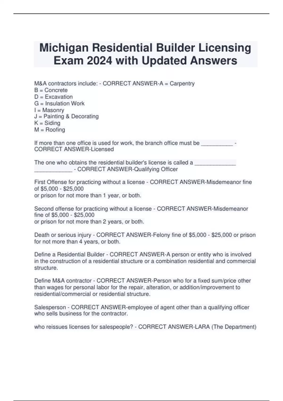 Michigan Residential Builder Licensing Exam 2024 with Updated Answers M&A contractors include: - CORRECT ANSWER-A = Carpentry B = Concrete D = Excavation G = Insulation Work I = Masonry J = Painting & Decorating K = Siding M = Roofing If more than one office is used for work, the branch office must be __________ - CORRECT ANSWER-Licensed The one who obtains the residential builder's license is called a _____________ ____________ - CORRECT ANSWER-Qualifying Officer First Offense for practicing without a license - CORRECT ANSWER-Misdemeanor fine of $5,000 - $25,000 or prison for not more than 1 year, or both. Second offense for practicing without a license - CORRECT ANSWER-Misdemeanor fine of $5,000 - $25,000 or prison for not more than 2 years, or both. Death or serious injury - CORRECT ANSWER-Felony fine of $5,000 - $25,000 or prison for not more than 4 years, or both. Define a Residential Builder - CORRECT ANSWER-A person or entity who is involved in the construction of a residential structure or a combination residential and commercial structure. Define M&A contractor - CORRECT ANSWER-Person who for a fixed sum/price other than wages for personal labor for the repair, alteration, or addition/improvement to residential/commercial or residential structure. Salesperson - CORRECT ANSWER-employee of agent other than a qualifying officer who sells business for the contractor. who reissues licenses for salespeople? - CORRECT ANSWER-LARA (The Department) Which types of trade work require a different type of license other than the resi license? - CORRECT ANSWER-Plumbing, Electrical, and Mechanical. Who issues the license? - CORRECT ANSWER-LARA How is the director of LARA appointed? - CORRECT ANSWER-by the governor What types of people make up the Board of Residential Builders? - CORRECT ANSWER-4 Licensed residential builders 2 M&A contractors 3 members of the public What are the duties of the board of residential builders? (4) - CORRECT ANSWER-1. Interpretation of a license requirement 2. Aid in investigations 3. Set acceptable practice standards 4. Assess penalties for those who are licensed and are in violation of rules What happens if the qualifying officer's license is revoked? - CORRECT ANSWER-The entity's license is revoked as well. How can a foreign entity get a license? - CORRECT ANSWER-Only if authorized by the Corporations and Securities Commission. Non residents must file this to be considered for a license. - CORRECT ANSWER-An Irrevocable consent to service of process T or F, Builders must maintain a place of business in the state they operate in. - CORRECT ANSWER-True T of F, Contractors must maintain an accurate set of books/records open to inspection by the department (LARA). - CORRECT ANSWER-True If the department inquires, licensees must submit ___________ _____________ ___________ showing licensee's current financial status, and must do so within 30 days of inquiry. - CORRECT ANSWER-sworn financial statements T or F, Advertising must not misrepresent material facts. - CORRECT ANSWER-True Licensee shall include ____________, _______________, and ________________ in all advertising - CORRECT ANSWER-name, license number, and actual business address Is it legal to pay money or give gifts to customers in exchang