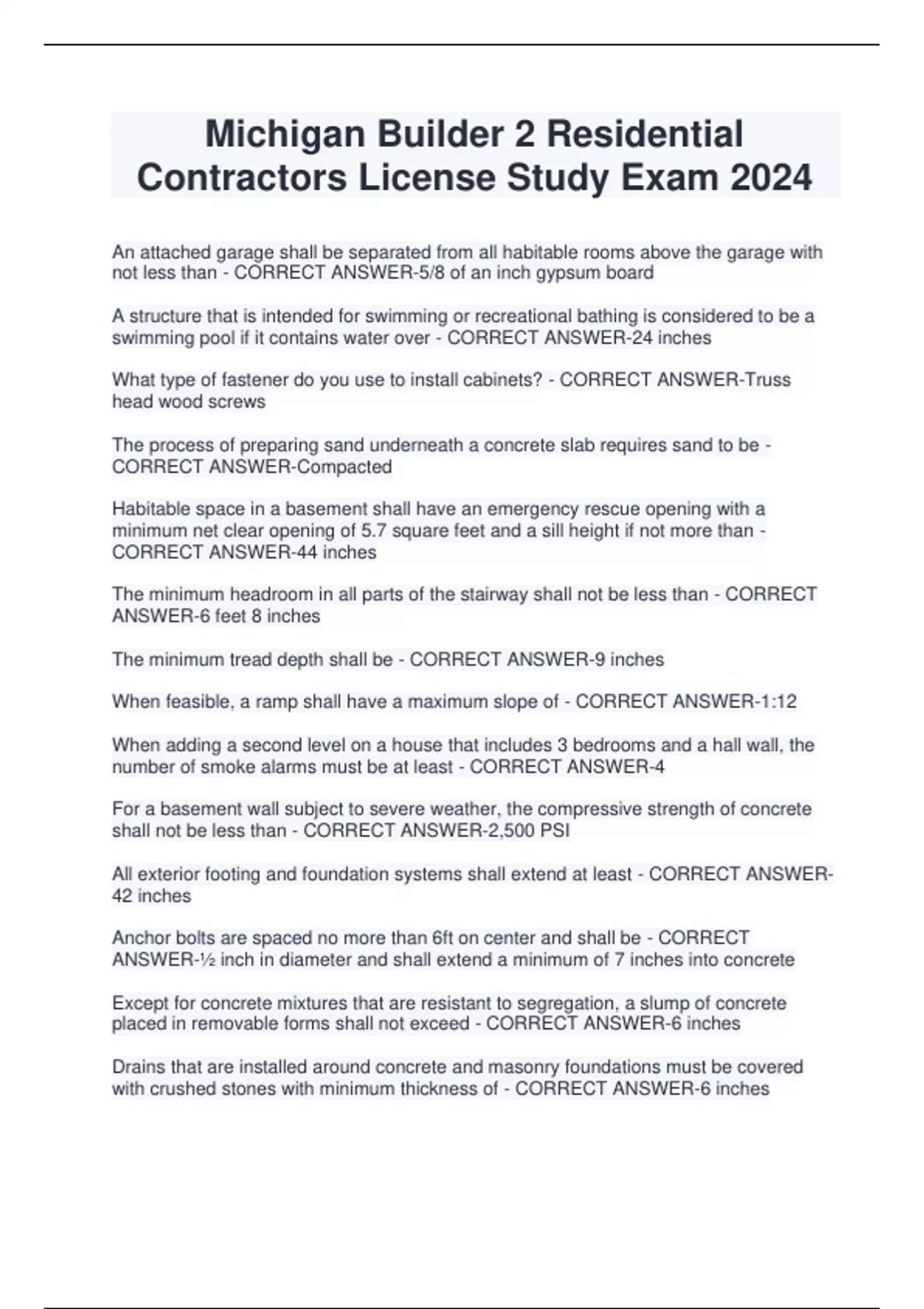 Michigan Builder 2 Residential Contractors License Study Exam 2024 An attached garage shall be separated from all habitable rooms above the garage with not less than - CORRECT ANSWER-5/8 of an inch gypsum board A structure that is intended for swimming or recreational bathing is considered to be a swimming pool if it contains water over - CORRECT ANSWER-24 inches What type of fastener do you use to install cabinets? - CORRECT ANSWER-Truss head wood screws The process of preparing sand underneath a concrete slab requires sand to be - CORRECT ANSWER-Compacted Habitable space in a basement shall have an emergency rescue opening with a minimum net clear opening of 5.7 square feet and a sill height if not more than - CORRECT ANSWER-44 inches The minimum headroom in all parts of the stairway shall not be less than - CORRECT ANSWER-6 feet 8 inches The minimum tread depth shall be - CORRECT ANSWER-9 inches When feasible, a ramp shall have a maximum slope of - CORRECT ANSWER-1:12 When adding a second level on a house that includes 3 bedrooms and a hall wall, the number of smoke alarms must be at least - CORRECT ANSWER-4 For a basement wall subject to severe weather, the compressive strength of concrete shall not be less than - CORRECT ANSWER-2,500 PSI All exterior footing and foundation systems shall extend at least - CORRECT ANSWER42 inches Anchor bolts are spaced no more than 6ft on center and shall be - CORRECT ANSWER-½ inch in diameter and shall extend a minimum of 7 inches into concrete Except for concrete mixtures that are resistant to segregation, a slump of concrete placed in removable forms shall not exceed - CORRECT ANSWER-6 inches Drains that are installed around concrete and masonry foundations must be covered with crushed stones with minimum thickness of - CORRECT ANSWER-6 inches A concrete mix of 1:2:4 means - CORRECT ANSWER-1 part cement, 2 parts sand and 4 parts aggregate Masonry veneer shall be anchored to the supporting wall with corrosion-resistant metal ties embedded in water and extending into the veneer a minimum of - CORRECT ANSWER-1 1/2 inches Fasteners for asphalt shingles shall be galvanized or stainless steel with a minimum 12 gage shank and it must be of a length that penetrates a minimum of ______ into the roof sheathing - CORRECT ANSWER-¾ inch An ice barrier shall consist of at least 2 layers of underlayment cemented together and shall extend at least ____ inside the exterior wall line of the building - CORRECT ANSWER-24 inches An employer who willfully violates the Michigan Occupational Safety and Health Administration (MIOSHA) rules for the second time and which violation causes death to an employee shall be fined the following - CORRECT ANSWER-Not more than $20,000 or three years in prison or bot