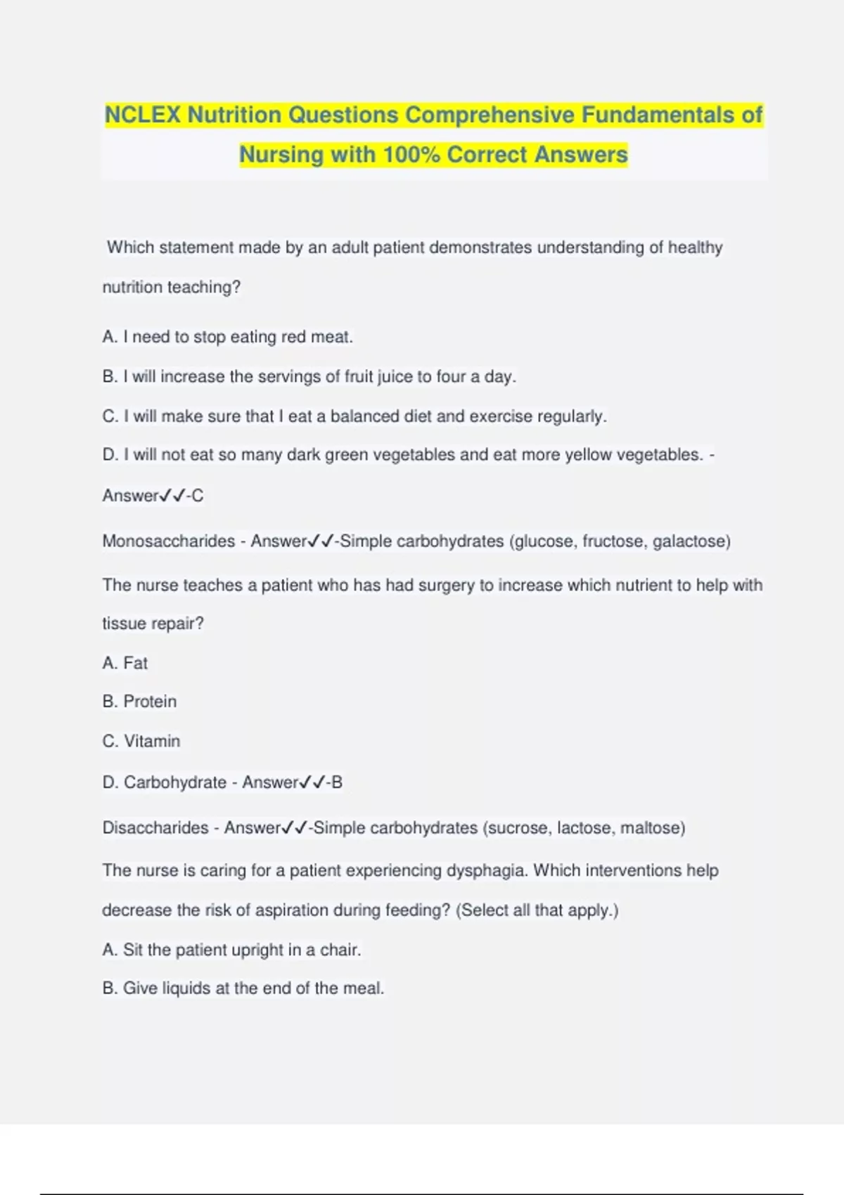 NCLEX Nutrition Questions Comprehensive Fundamentals of Nursing with 100% Correct Answers Which statement made by an adult patient demonstrates understanding of healthy nutrition teaching? A. I need to stop eating red meat. B. I will increase the servings of fruit juice to four a day. C. I will make sure that I eat a balanced diet and exercise regularly. D. I will not eat so many dark green vegetables and eat more yellow vegetables. - Answer️️ -C Monosaccharides - Answer️️ -Simple carbohydrates (glucose, fructose, galactose) The nurse teaches a patient who has had surgery to increase which nutrient to help with tissue repair? A. Fat B. Protein C. Vitamin D. Carbohydrate - Answer️️ -B Disaccharides - Answer️️ -Simple carbohydrates (sucrose, lactose, maltose) The nurse is caring for a patient experiencing dysphagia. Which interventions help decrease the risk of aspiration during feeding? (Select all that apply.) A. Sit the patient upright in a chair. B. Give liquids at the end of the meal. C. Place food in the strong side of the mouth. D. Provide thin foods to make it easier to swallow. E. Feed the patient slowly, allowing time to chew and swallow. F. Encourage patient to lie down to rest for 30 minutes after eating. - Answer️️ -A, C, E Polysaccharides - Answer️️ -Complex carbohydrates (starch, fiber, glycogen) The nurse suspects that the patient receiving parenteral nutrition (PN) through a central venous catheter (CVC) has an air embolus. What action does the nurse need to take first? A. Raise head of bed to 90 degrees B. Turn patient to left lateral decubitus position C. Notify health care provider immediately D. Have patient perform the Valsalva maneuver - Answer️️ -B The acceptable macronutrient distribution range for carbohydrates is a. 20-30% of cal b. 45-65% of cal c. 10-25% of cal d. 30-45% of cal - Answer️️ -b. 45-65% of cal Which action is initially taken by the nurse to verify correct position of a newly placed small-bore feeding tube? A. Placing an order for x-ray film examination to check position B. Confirming the distal mark on the feeding tube after taping C. Testing the pH of the gastric contents and observing the color D. Auscultating over the gastric area as air is injected into the tube - Answer️️ -A After the liver converts fructose and galactose into glucose, it is released into the bloodstream, elevating blood glucose levels. This causes the release of _____ from the pancreas - Answer️️ -insulin The catheter of the patient receiving parenteral nutrition (PN) becomes occluded. Place the steps for caring for the occluded catheter in the order in which the nurse would perform them. A. Attempt to aspirate a clot. B. Temporarily stop the infusion. C. Flush the line with saline or heparin. D. Use a thrombolytic agent if ordered or per protocol. - Answer️️ -B, C, A, D Which correctly defines the total fiber adequate intake? a. 25 g/day for women and 38 g/day for men b. 10 g/day for women and 15 g/day for men c. 30 g/day for women and 35 g/day for men d. 28 g/day for women and 33 g/day for men - Answer️️ -a. 25 g/day for women and 38 g/day for men Based on knowledge of peptic ulcer disease (PUD), the nurse anticipates the presence of which bacteria when reviewing the laboratory data for a patient suspected of having PUD? A.Micrococcus B.Staphylococcus C.Corynebacterium D.Helicobacter pylori - Answer️️ -D