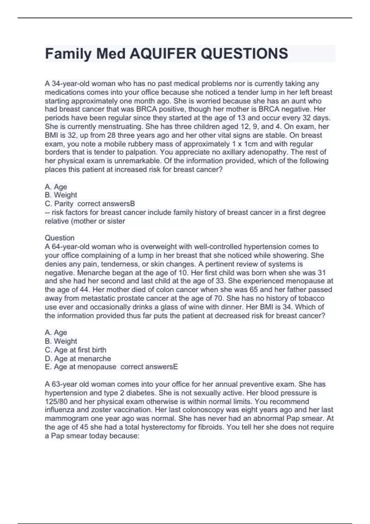 A 34-year-old woman who has no past medical problems nor is currently taking any medications comes into your office because she noticed a tender lump in her left breast starting approximately one month ago. She is worried because she has an aunt who had breast cancer that was BRCA positive, though her mother is BRCA negative. Her periods have been regular since they started at the age of 13 and occur every 32 days. She is currently menstruating. She has three children aged 12, 9, and 4. On exam, her BMI is 32, up from 28 three years ago and her other vital signs are stable. On breast exam, you note a mobile rubbery mass of approximately 1 x 1cm and with regular borders that is tender to palpation. You appreciate no axillary adenopathy. The rest of her physical exam is unremarkable. Of the information provided, which of the following places this patient at increased risk for breast cancer? A. Age B. Weight C. Parity correct answersB -- risk factors for breast cancer include family history of breast cancer in a first degree relative (mother or sister Question A 64-year-old woman who is overweight with well-controlled hypertension comes to your office complaining of a lump in her breast that she noticed while showering. She denies any pain, tenderness, or skin changes. A pertinent review of systems is negative. Menarche began at the age of 10. Her first child was born when she was 31 and she had her second and last child at the age of 33. She experienced menopause at the age of 44. Her mother died of colon cancer when she was 65 and her father passed away from metastatic prostate cancer at the age of 70. She has no history of tobacco use ever and occasionally drinks a glass of wine with dinner. Her BMI is 34. Which of the information provided thus far puts the patient at decreased risk for breast cancer? A. Age B. Weight C. Age at first birth D. Age at menarche E. Age at menopause correct answersE A 63-year old woman comes into your office for her annual preventive exam. She has hypertension and type 2 diabetes. She is not sexually active. Her blood pressure is 125/80 and her physical exam otherwise is within normal limits. You recommend influenza and zoster vaccination. Her last colonoscopy was eight years ago and her last mammogram one year ago was normal. She has never had an abnormal Pap smear. At the age of 45 she had a total hysterectomy for fibroids. You tell her she does not require a Pap smear today because: