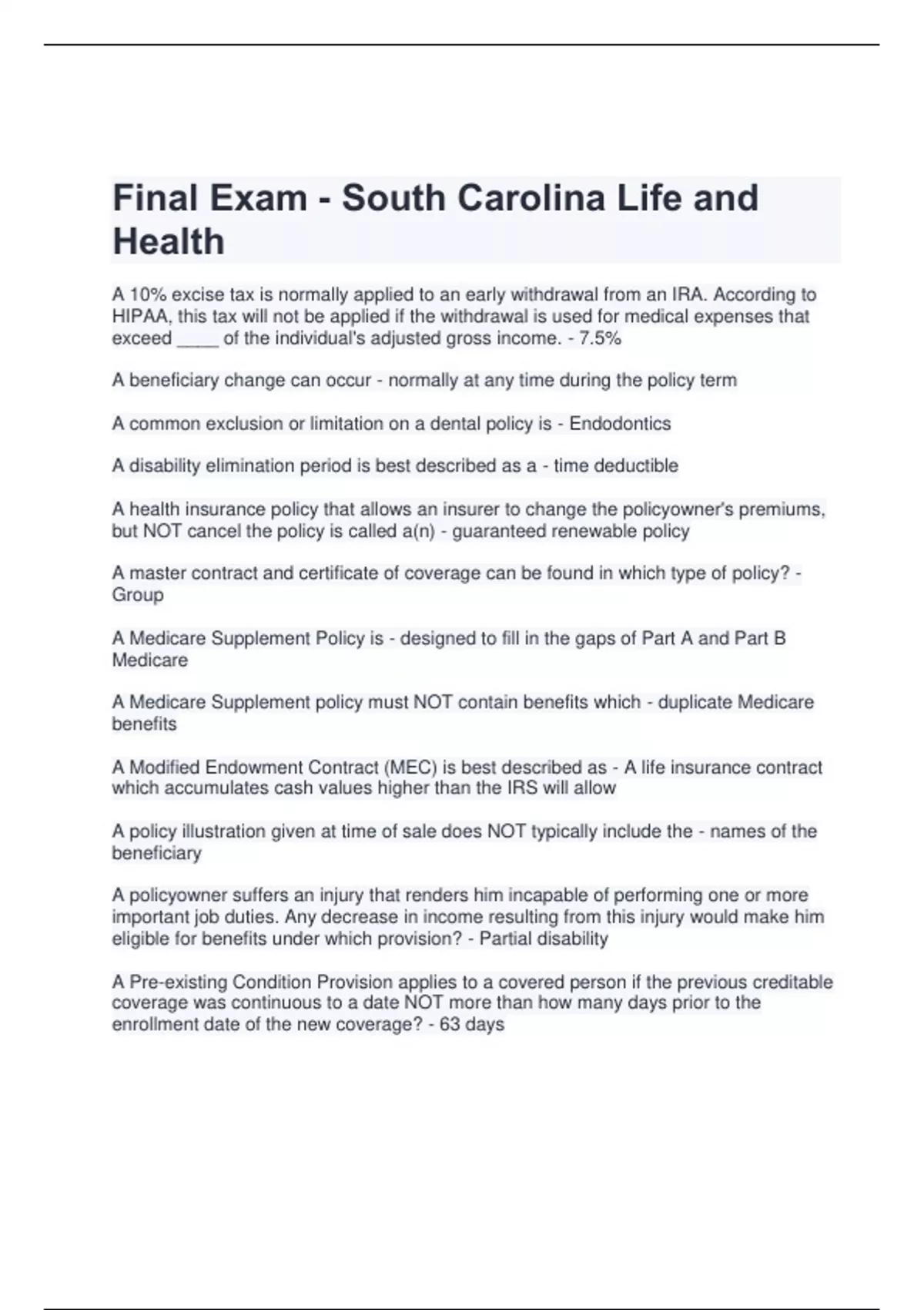 A 10% excise tax is normally applied to an early withdrawal from an IRA. According to HIPAA, this tax will not be applied if the withdrawal is used for medical expenses that exceed ____ of the individual's adjusted gross income. - 7.5% A beneficiary change can occur - normally at any time during the policy term A common exclusion or limitation on a dental policy is - Endodontics A disability elimination period is best described as a - time deductible A health insurance policy that allows an insurer to change the policyowner's premiums, but NOT cancel the policy is called a(n) - guaranteed renewable policy A master contract and certificate of coverage can be found in which type of policy? - Group A Medicare Supplement Policy is - designed to fill in the gaps of Part A and Part B Medicare A Medicare Supplement policy must NOT contain benefits which - duplicate Medicare benefits A Modified Endowment Contract (MEC) is best described as - A life insurance contract which accumulates cash values higher than the IRS will allow A policy illustration given at time of sale does NOT typically include the - names of the beneficiary A policyowner suffers an injury that renders him incapable of performing one or more important job duties. Any decrease in income resulting from this injury would make him eligible for benefits under which provision? - Partial disability A Pre-existing Condition Provision applies to a covered person if the previous creditable coverage was continuous to a date NOT more than how many days prior to the enrollment date of the new coverage? - 63 days