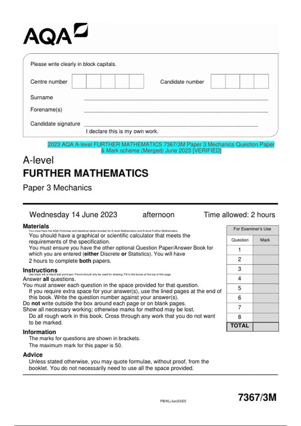 2023 AQA A-level and FURTHER MATHEMATICS Question Paper & Mark scheme (Merged) June 2023 [VERIFIED]