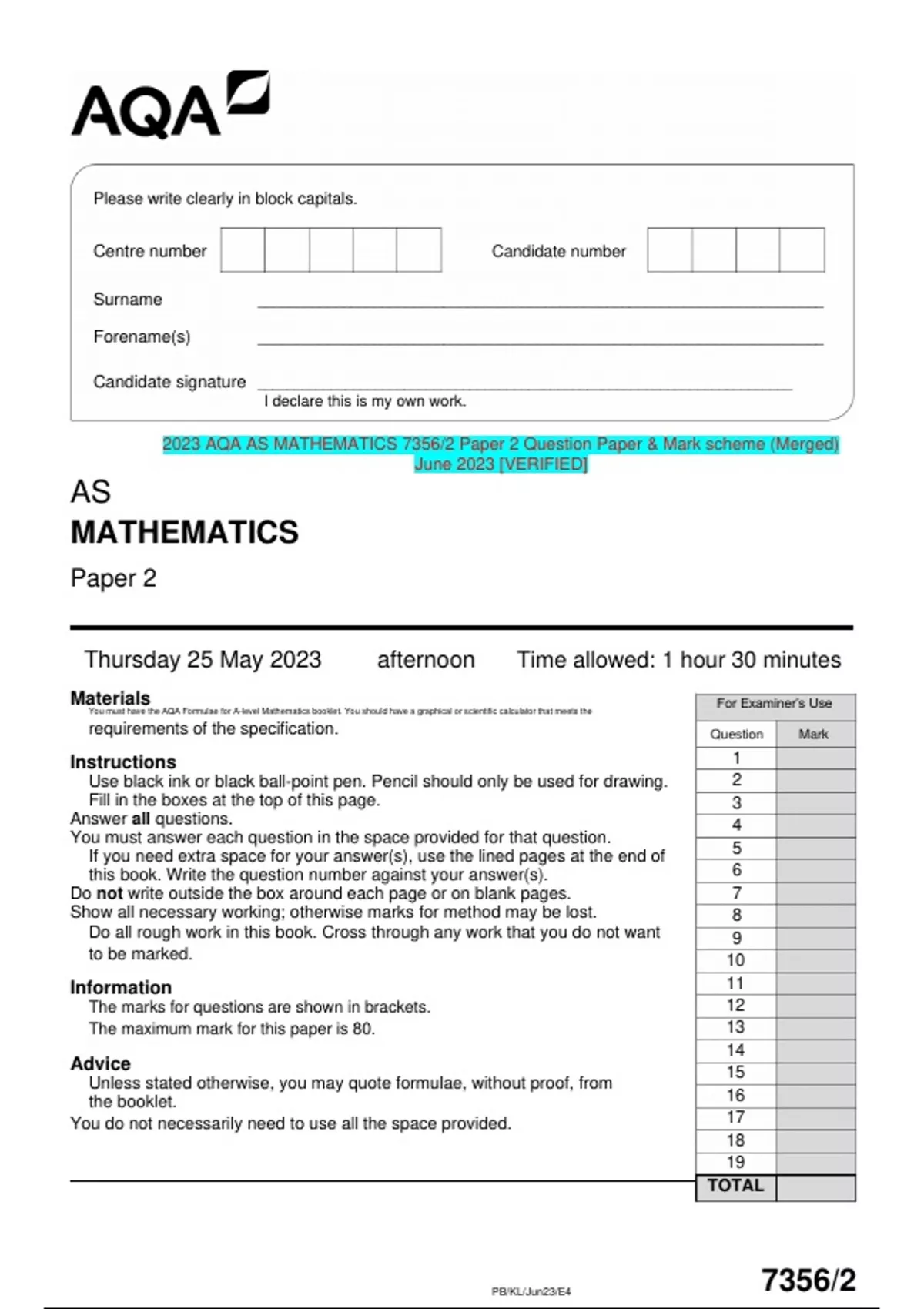 2023 AQA AS MATHEMATICS 7356/2 Paper 2 Question Paper & Mark scheme (Merged) June 2023 [VERIFIED]