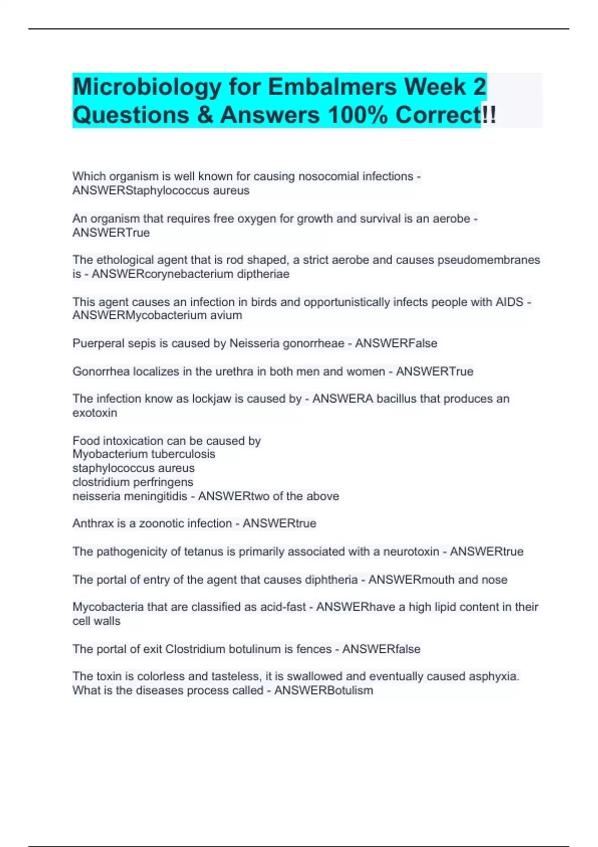 Microbiology for Embalmers We Which organism is well known for causing nosocomial infections - ANSWERStaphylococcus aureus An organism that requires free oxygen for growth and survival is an aerobe - ANSWERTrue The ethological agent that is rod shaped, a strict aerobe and causes pseudomembranes is - ANSWERcorynebacterium diptheriae This agent causes an infection in birds and opportunistically infects people with AIDS - ANSWERMycobacterium avium ek 2 Questions & Answers 100% Correct!!
