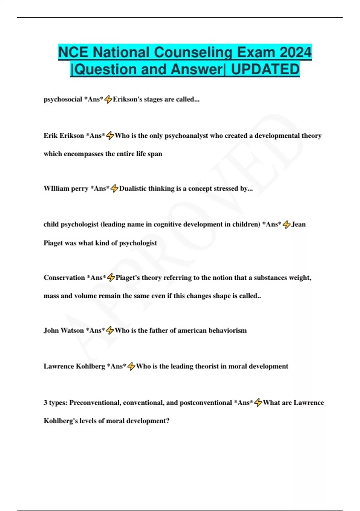 NCE National Counseling Exam 2024 |Question and Answer| UPDATED psychosocial *Ans* Erikson's stages are called... Erik Erikson *Ans* Who is the only psychoanalyst who created a developmental theory which encompasses the entire life span WIlliam perry *Ans* Dualistic thinking is a concept stressed by... child psychologist (leading name in cognitive development in children) *Ans* Jean Piaget was what kind of psychologist Conservation *Ans* Piaget's theory referring to the notion that a substances weight, mass and volume remain the same even if this changes shape is called.. John Watson *Ans* Who is the father of american behaviorism Lawrence Kohlberg *Ans* Who is the leading theorist in moral development 3 types: Preconventional, conventional, and postconventional *Ans* What are Lawrence Kohlberg's levels of moral development? Trust versus mistrust. *Ans* What is the first state of Erikson's 8 stages of development? Integrity versus despair *Ans* What is Erikson's 8th/final stage? Postconventional morality (where the individual has self-imposed morals and ethics) *Ans* What is Kohlberg's highest level of morality? Post Conventional *Ans* What is kohlberg's 3rd stage of morality? Lev Vygotsky *Ans* The zone of proximal development was pioneered by Latency *Ans* What is the only Freudian developmental stage which is not primarily psychosexual in nature? Preconventional Level: 1.)punishment/obedience orientatio