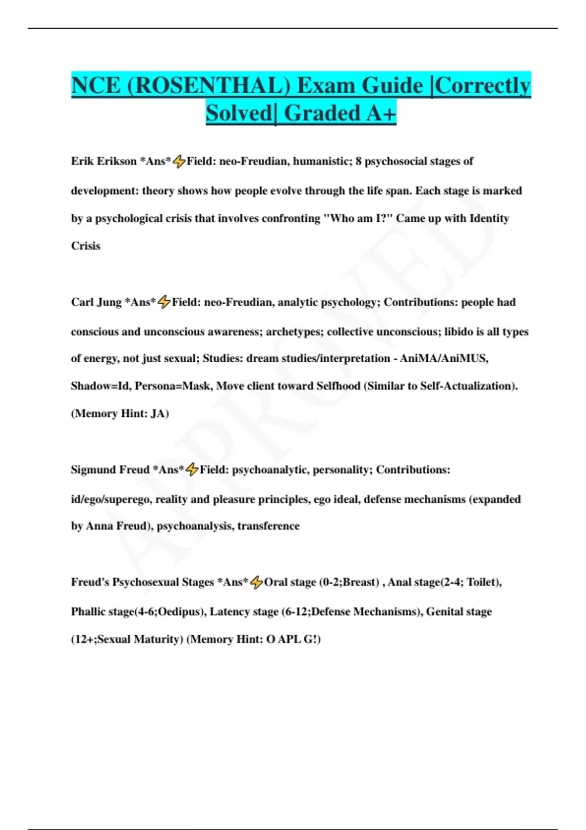 NCE (ROSENTHAL) Exam Guide |Correctly Solved| Graded A+ Erik Erikson *Ans* Field: neo-Freudian, humanistic; 8 psychosocial stages of development: theory shows how people evolve through the life span. Each stage is marked by a psychological crisis that involves confronting "Who am I?" Came up with Identity Crisis Carl Jung *Ans* Field: neo-Freudian, analytic psychology; Contributions: people had conscious and unconscious awareness; archetypes; collective unconscious; libido is all types of energy, not just sexual; Studies: dream studies/interpretation - AniMA/AniMUS, Shadow=Id, Persona=Mask, Move client toward Selfhood (Similar to Self-Actualization). (Memory Hint: JA) Sigmund Freud *Ans* Field: psychoanalytic, personality; Contributions: id/ego/superego, reality and pleasure principles, ego ideal, defense mechanisms (expanded by Anna Freud), psychoanalysis, transference Freud's Psychosexual Stages *Ans* Oral stage (0-2;Breast) , Anal stage(2-4; Toilet), Phallic stage(4-6;Oedipus), Latency stage (6-12;Defense Mechanisms), Genital stage (12+;Sexual Maturity) (Memory Hint: O APL G!) Oedipus Complex *Ans* Feelings of rivalry with the parent of the same sex and sexual desire for the parent of the other sex, occurring during the phallic stage and ultimately resolved through identification with the parent of the same sex. Ego Ideal *Ans* Part of the superego that consists of what one would like to be; The superego compares the ego's actions and will reward or punish the ego accordingly; An overly rewarding or punishing superego can be detrimental Abraham Maslow *Ans* Field: humanism; Contributions: hierarchy of needs-needs at a lower level (safety and psych) dominate an individual's motivation as long as they are unsatisfied, self-actualization, transcendence John Bowlby *Ans* British psychologist- said that in order to lead a normal social life the child must bond to an adult before age 3. Saw bonding and attachment as having survival value (adaptive significance). If bond is severed at an early age, it is called object loss, which is a breeding ground for abnormal behavior. Said mothers should be primary caretakers and fathers role is to support mother emotionally ra