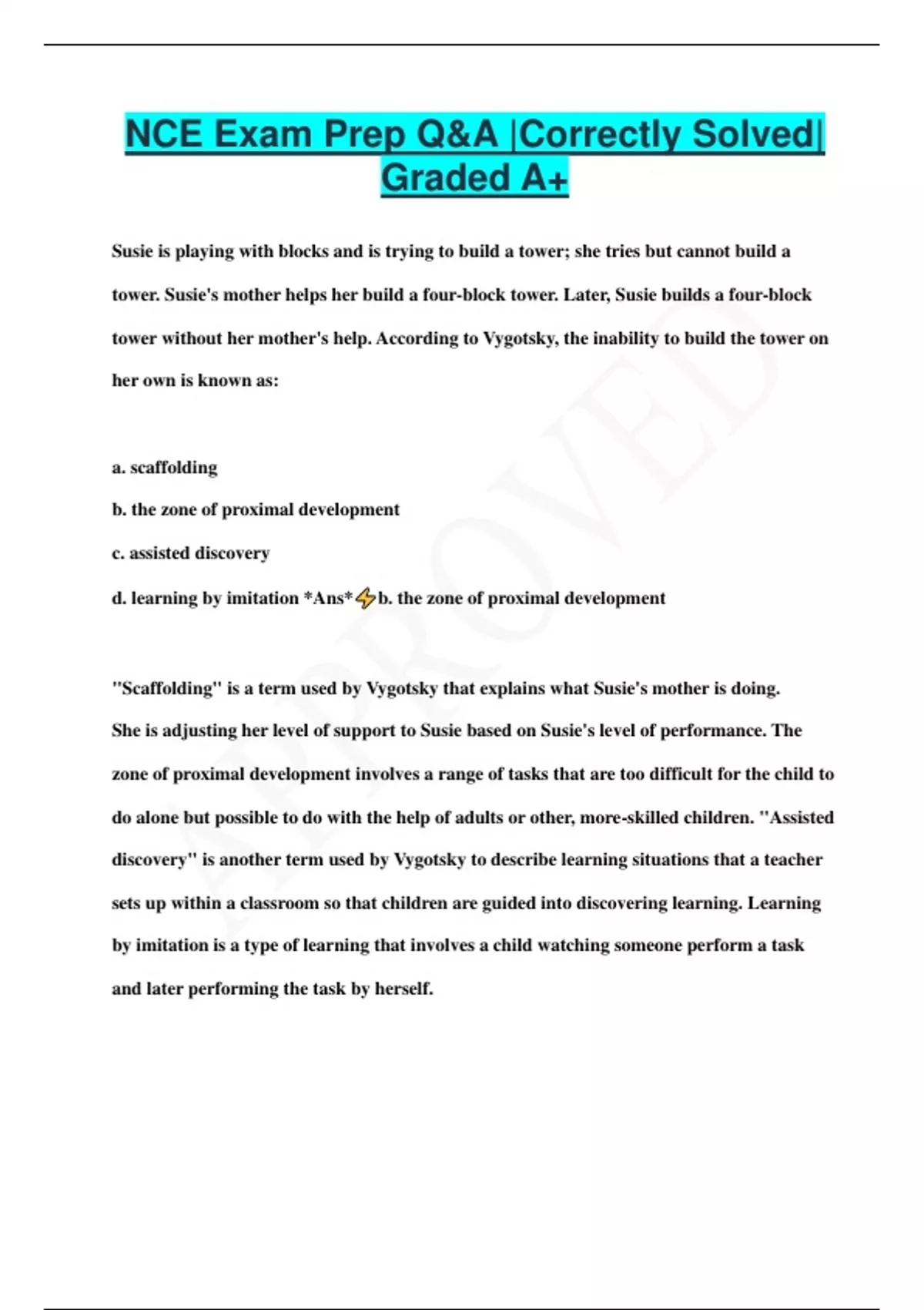 NCE Exam Prep Q&A |Correctly Solved| Graded A+ Susie is playing with blocks and is trying to build a tower; she tries but cannot build a tower. Susie's mother helps her build a four-block tower. Later, Susie builds a four-block tower without her mother's help. According to Vygotsky, the inability to build the tower on her own is known as: a. scaffolding b. the zone of proximal development c. assisted discovery d. learning by imitation *Ans* b. the zone of proximal development "Scaffolding" is a term used by Vygotsky that explains what Susie's mother is doing. She is adjusting her level of support to Susie based on Susie's level of performance. The zone of proximal development involves a range of tasks that are too difficult for the child to do alone but possible to do with the help of adults or other, more-skilled children. "Assisted discovery" is another term used by Vygotsky to describe learning situations that a teacher sets up within a classroom so that children are guided into discovering learning. Learning by imitation is a type of learning that involves a child watching someone perform a task and later performing the task by herself. According to Erickson, when an individual fails to develop a strong sense of identity, the individual will have troubles with the development of: a. autonomy b. initiative c. intimacy d. integrity *Ans* c. . intimacy In Erickson's theory of psychosocial development, individuals who fail to achieve the goal of the lower level of development will have problems attaining the developmental task at the next stage of development. In the example above, the individual failed to achieve identity, which occurs during adolescence. Therefore, in young adulthood, the individual will have problems attaining intimacy, which is the developmental task to be achieved at this level. For autonomy, the individual would have to have failed to attain basic trust; for initiative, the individual would have to have failed to attain autonomy; and for integrity, the individual would have to have failed to attain generativity. Which of the following is the correct sequence of stages in Freud's theory of personality development? a. Oral, genital, latency, anal, phallic b. Genital, anal, phallic, oral, latency c. Latency, phallic, oral, anal, genital d. Oral, anal, phallic, latency, genital *Ans* d. Oral, anal, phallic, latency, genital The best way to remember Freud's psychosexual stages of development is to think about what key tasks individuals do throughout childhood. The first thing infants do is suck (oral). Next, babies begin toilet training (anal), then discover the difference between boys and girls (phallic). Next, children spend time growing physically and cognitively but are latent in the psychosexual realm (not focusing on anything sexual); finally, puberty sets in and they begin to think about sex again and are focused on their own genitals. Jacob's father tells Jacob to clean his room. When Jacob asks why, his father responds, "Because I said so." The father's response is most representative of which parenting style? a. Uninvolved b. Authoritarian c. Authoritative d. Permissive *Ans* b. Authoritarian The authoritarian parenting style uses coercive techniques and psychological control t