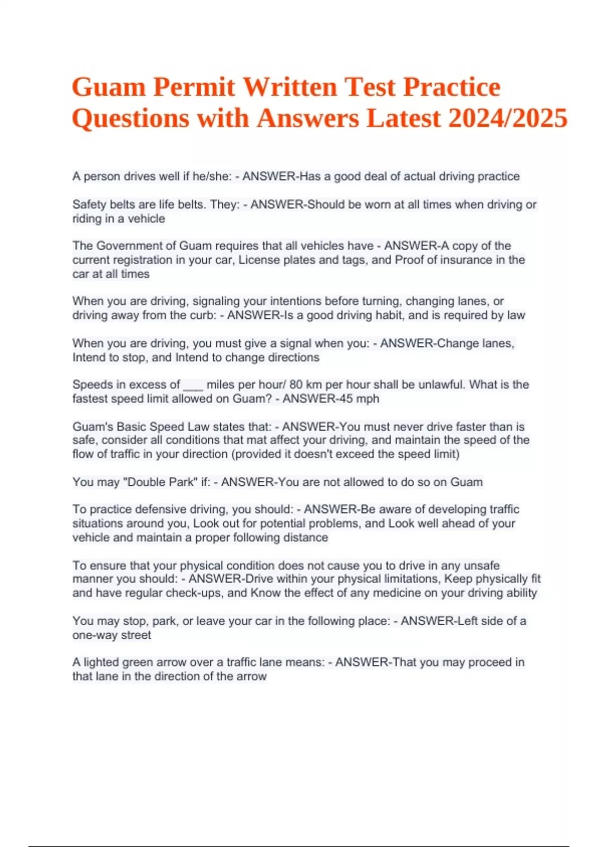 Guam Permit Written Test Practice Questions with Answers Latest 2024/2025 (GRADED)