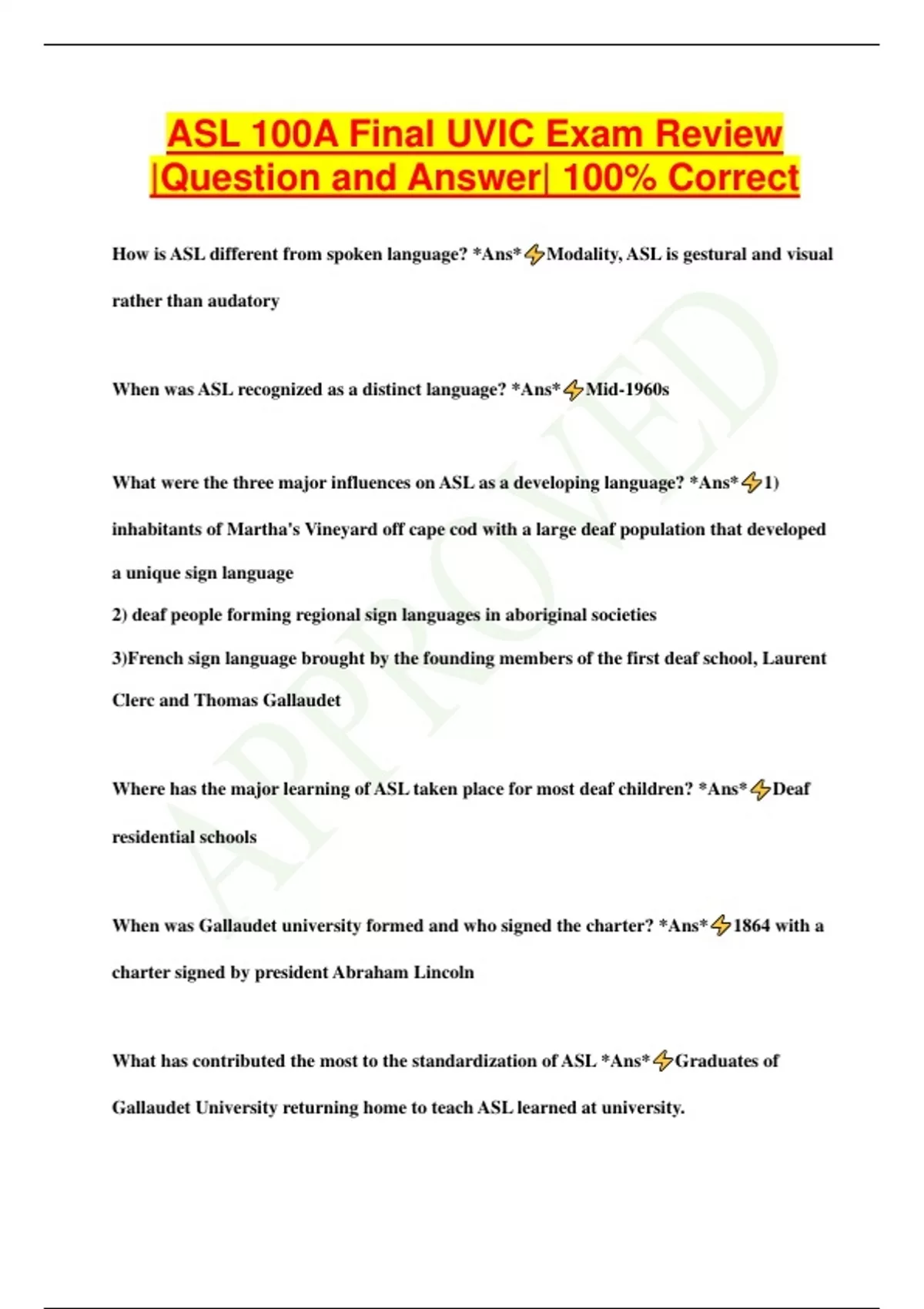 ASL 100A Final UVIC Exam Review |Question and Answer| 100% Correct How is ASL different from spoken language? *Ans* Modality, ASL is gestural and visual rather than audatory When was ASL recognized as a distinct language? *Ans* Mid-1960s What were the three major influences on ASL as a developing language? *Ans* 1) inhabitants of Martha's Vineyard off cape cod with a large deaf population that developed a unique sign language 2) deaf people forming regional sign languages in aboriginal societies 3)French sign language brought by the founding members of the first deaf school, Laurent Clerc and Thomas Gallaudet Where has the major learning of ASL taken place for most deaf children? *Ans* Deaf residential schools When was Gallaudet university formed and who signed the charter? *Ans* 1864 with a charter signed by president Abraham Lincoln What has contributed the most to the standardization of ASL *Ans* Graduates of Gallaudet University returning home to teach ASL learned at university. What pivotal moment in ASL and Deaf American history occured in 1880? *Ans* The International Congress on Education of the Deaf conference in Milan, Italy chose to support the oral instruction for Deaf students. During the period following the choice of oral instruction for Deaf students, how did ASL persist? *Ans* Students used it as a means of communication outside the classroom in dormitories and playing fields. After banning sign language in classrooms how did Deaf perception of ASL and themselves as capable individuals change? *Ans* There perceptions diminished and and pride and confidence waned. What helped keep Deaf culture and ASL alive through the mandatory oral instruction for Deaf students? *Ans* The ability to continue to network wi each other at Deaf clubs, Gallaudet University, and other social events. When was the first Deaf president of Gallaudet University appointed following mass protest from students when a hearing, non-ASL speaking president was appointed? *Ans* 1988