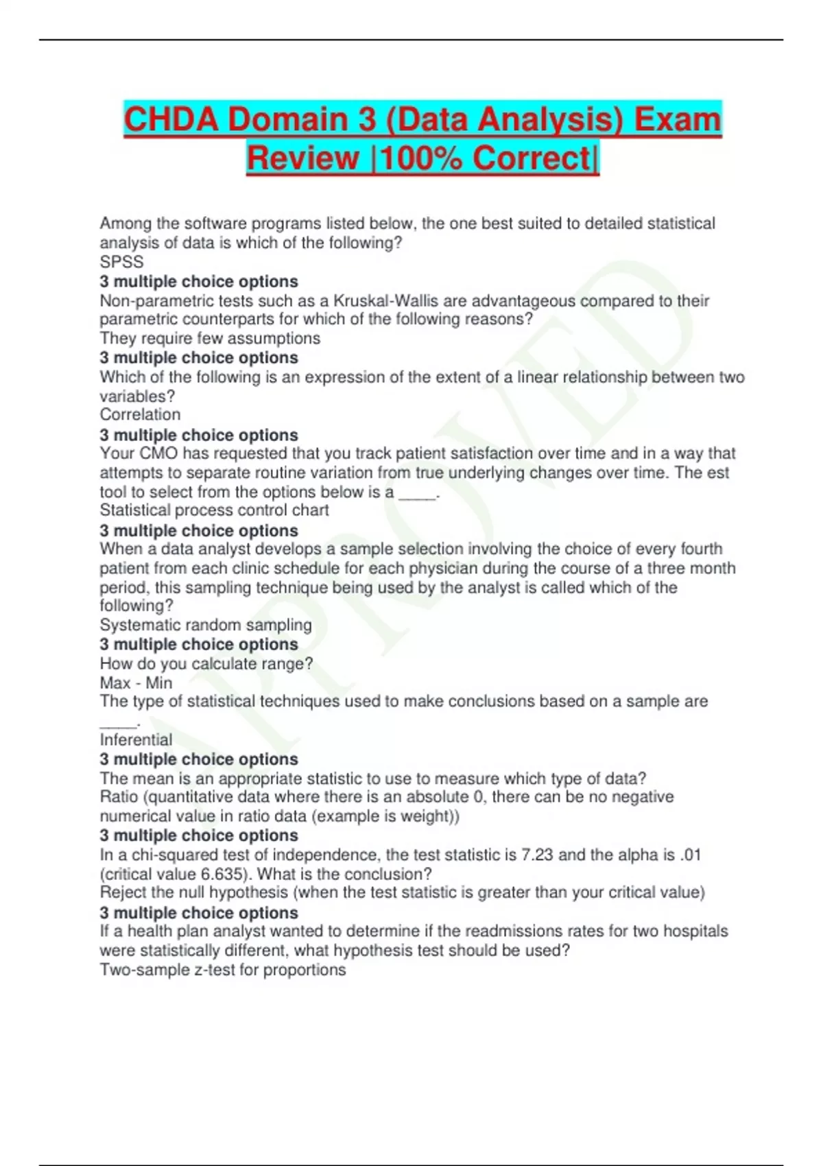 CHDA Domain 3 (Data Analysis) Exam Review |100% Correct| Among the software programs listed below, the one best suited to detailed statistical analysis of data is which of the following? SPSS 3 multiple choice options Non-parametric tests such as a Kruskal-Wallis are advantageous compared to their parametric counterparts for which of the following reasons? They require few assumptions 3 multiple choice options Which of the following is an expression of the extent of a linear relationship between two variables? Correlation 3 multiple choice options Your CMO has requested that you track patient satisfaction over time and in a way that attempts to separate routine variation from true underlying changes over time. The est tool to select from the options below is a ____. Statistical process control chart 3 multiple choice options When a data analyst develops a sample selection involving the choice of every fourth patient from each clinic schedule for each physician during the course of a three month period, this sampling technique being used by the analyst is called which of the following? Systematic random sampling 3 multiple choice options How do you calculate range? Max - Min The type of statistical techniques used to make conclusions based on a sample are ____. Inferential 3 multiple choice options The mean is an appropriate statistic to use to measure which type of data? Ratio (quantitative data where there is an absolute 0, there can be no negative numerical value in ratio data (example is weight)) 3 multiple choice options In a chi-squared test of independence, the test statistic is 7.23 and the alpha is .01 (critical value 6.635). What is the conclusion? Reject the null hypothesis (when the test statistic is greater than your critical value) 3 multiple choice options If a health plan analyst wanted to determine if the readmissions rates for two hospitals were statistically different, what hypothesis test should be used? Two-sample z-test for proportions 3 multiple choice options A researcher would like to test the null hypothesis that the LOS at two hospitals are equal. What statistical test should the researcher use in this situation? t-test for means 3 multiple choice options We want to compare the average weight of patients before and after a specialty diet is administered. We expect the weight to decrease after administration of the diet. Which of the following tests should be conducted to determine if the average weight for each patient is less at the conclusion of the diet? Paired t-test 3 multiple choice options The variable that may cause the change in a second variable is called the ____. Independent variable (the variable that is used to predict is called the independent, the outcome variable is the dependent) 3 multiple choice options If the correlation between years of experience and salary is positive, what can you conclude about the slope of a regression line that might be fit to describe the relationship? The slope will be positive 3 multiple choice options What are the assumptions made regarding the residuals in least squares regression? The mean is zero, they are all independent, they are approximately normally distributed A sampling technique that divides the population into subsets and then selects a random sample within each subset is called ____. Stratified random sampling (groups are called strata's and they are based on criteria) 3 multiple choice options In order to increase the precision of a confidence interval and leave the confidence level the same, the sample size must be ____. Larger 3 multiple choice options If an analyst is studying the wait times at a clinic and the only list of patients available is hard copu, which sampling technique is the easiest to use? Systematic sampling 3 multiple choice options What is the biggest problem with using mean LOS as a facility statistic? It is influenced by outlier values 3 multiple choice options ALOS is an example of a ___. Descriptive statistic 3 multiple choice options How do you calculate CMI? Sum(DRG weight * discharges)/Sum (discharges